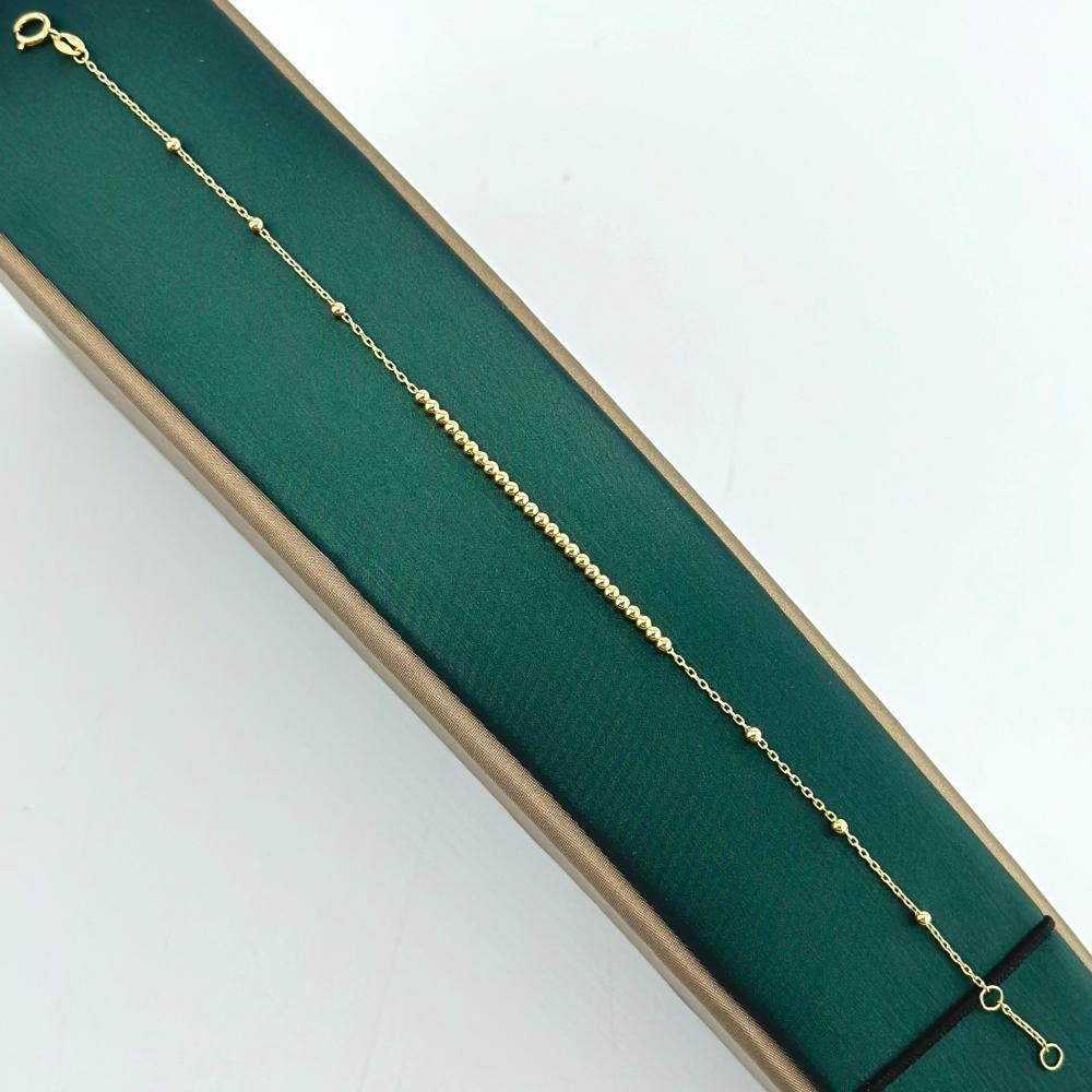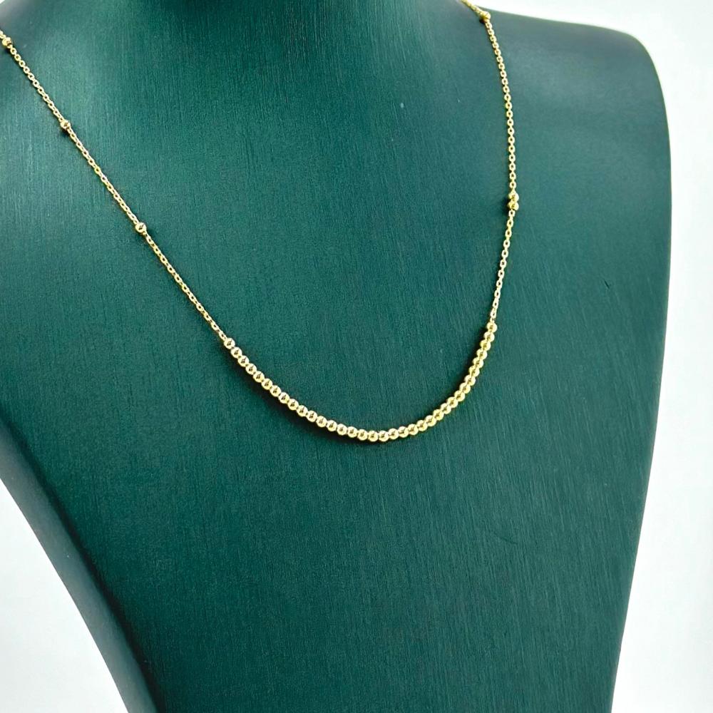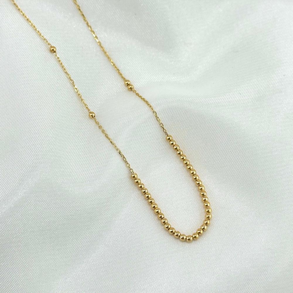 عقد وأسوارة من الذهب الأصفر عيار 18 بتصميم ناعم وبسيط، تحلّق حولك كرات الذهب الصغيرة كنجوم مضيئة تلامس بشرتك برفق. كل لمسة من هذا الطقم تروي حكاية من الأناقة الخالدة والبساطة الجذابة، ليضفي على إطلالتك سحراً لا يُقاوم، كهمسة رقيقة من الفخامة.✨