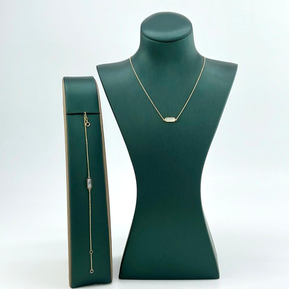 عقد مع اسوارة من الذهب الأصفر عيار 18 بتصميم إيطالي أنيق، تتألق فيه لمسة من الجمال الخالد مع حجر ملون يضفي عليه بريقاً ساحراً، ليكون رمزاً للأناقة والتميز في كل مناسبة.✨