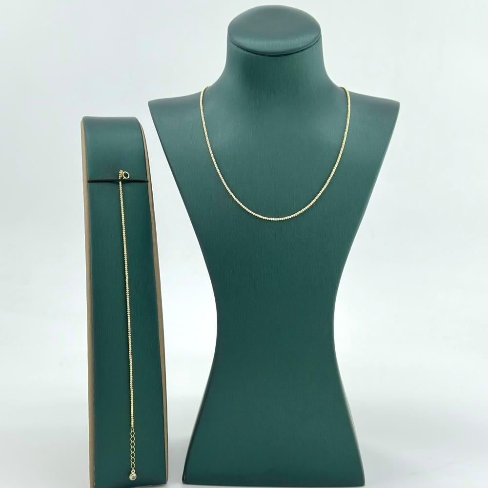 تألقي بطقم فاخر من الذهب عيار 18، يتألف من عقد و أسوارة مصممان بأناقة تحمل كرات إيطالية لماعة ذهبية متقنة الصنع. هذا الطقم المثالي يبرز جمالك في كل مناسبة، ويضفي لمسة من الرقي على إطلالتك.