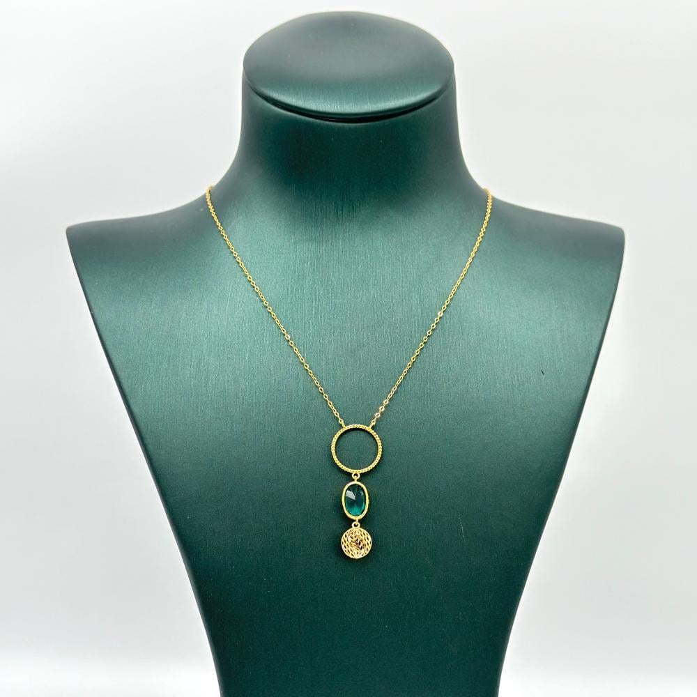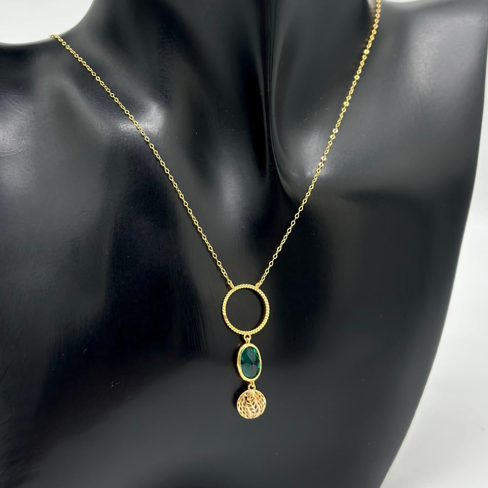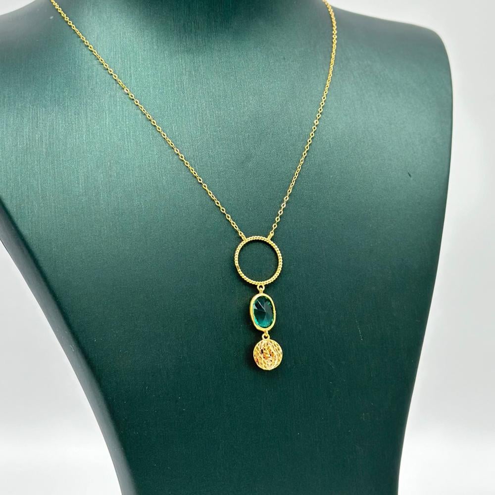 قلادة من الذهب عيار 21 قيراط، صاغت بعناية فائقة، تتجلى فيها حرفية لا مثيل لها وأناقة تخطف الأبصار. تتميز بتصميم متميز يجمع بين الأناقة والسحر، وتزينها حجر كريم زاهي يضفي عليها سحراً لا يقاوم. تتناغم خطوط التصميم بشكل استثنائي، مما يخلق بينها توازناً مثالياً، وتبرز جمال المرأة وتضفي عليها سحراً خاصاً في كل مناسبة.