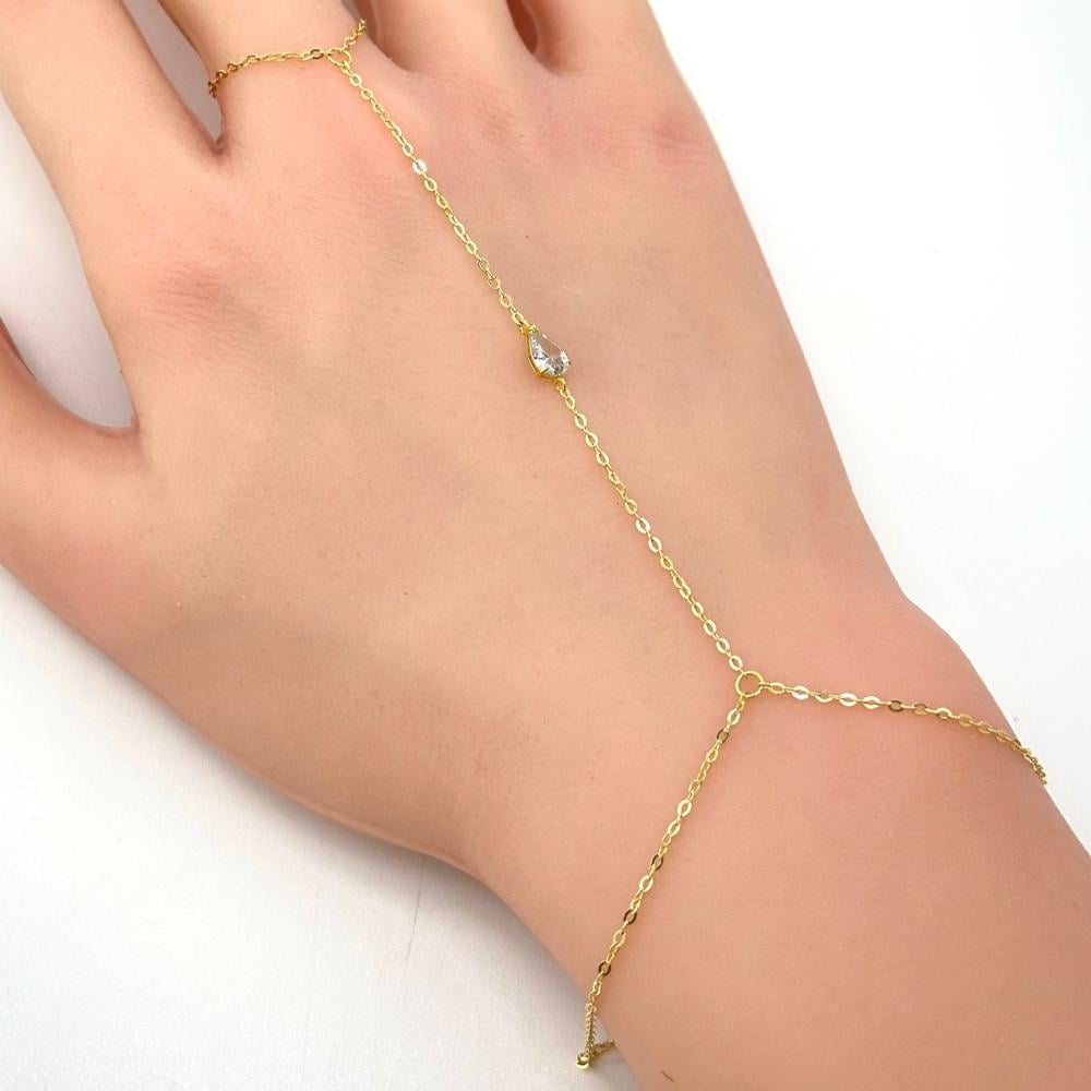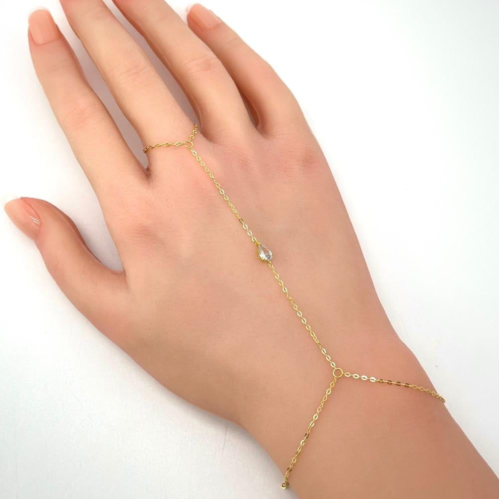 تميزي بكف ذهب عيار 18 بتصميم الماس ناعم، ينسدل برقة من المعصم إلى الإصبع بسلسلة ذهبية رفيعة تمنح اليد لمسة أنثوية دافئة. تتوزع فصوص الزركون بتناسق جذاب يعبّر عن الرومانسية والنعومة، لتكون القطعة المثالية لكل من تبحث عن الأناقة البسيطة مع لمسة مبهرة في تفاصيلها.
