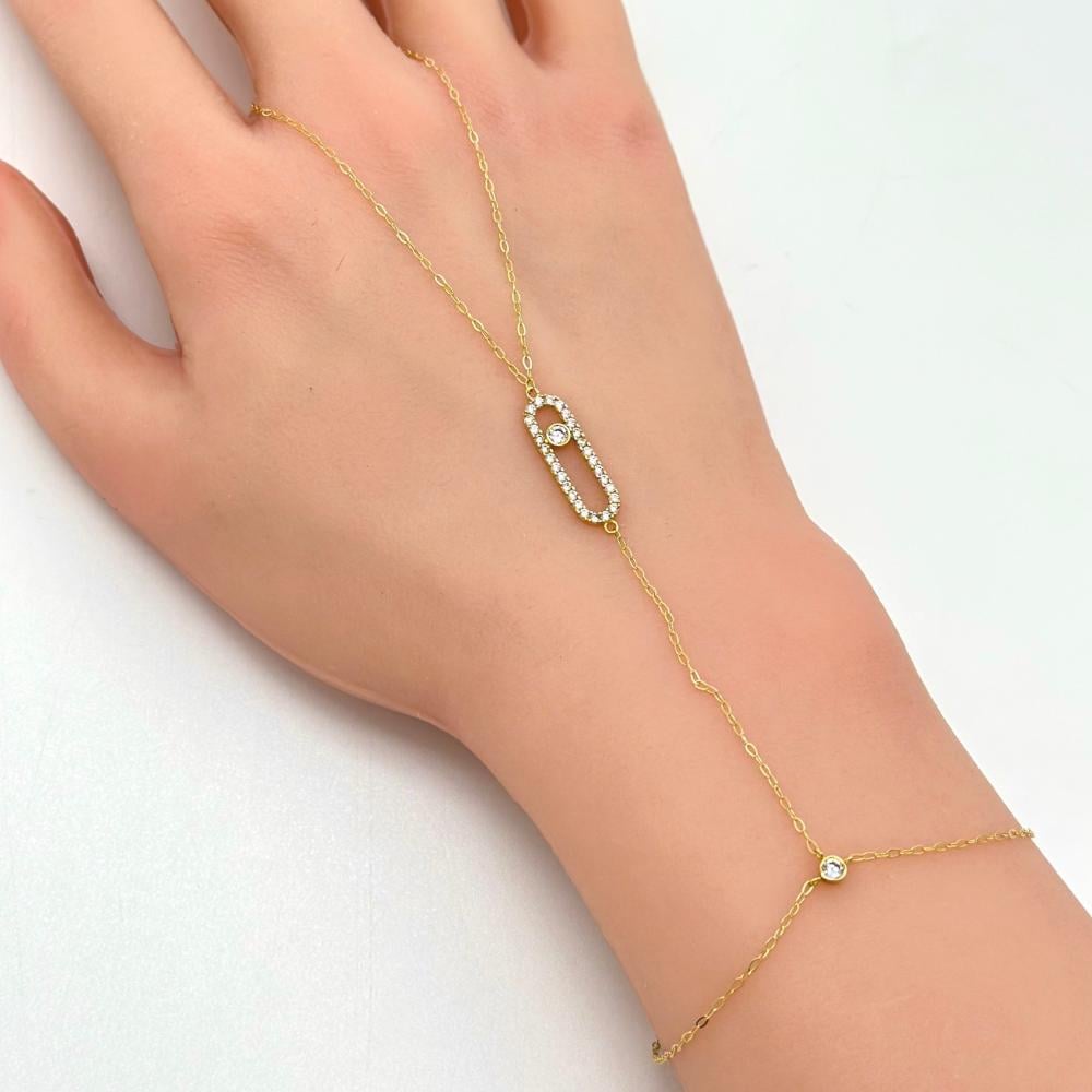 تميزي بكف ذهب عيار 18 بتصميم الماس ناعم، ينسدل برقة من المعصم إلى الإصبع بسلسلة ذهبية رفيعة تمنح اليد لمسة أنثوية دافئة. تتوزع فصوص الزركون بتناسق جذاب يعبّر عن الرومانسية والنعومة، لتكون القطعة المثالية لكل من تبحث عن الأناقة البسيطة مع لمسة مبهرة في تفاصيلها.