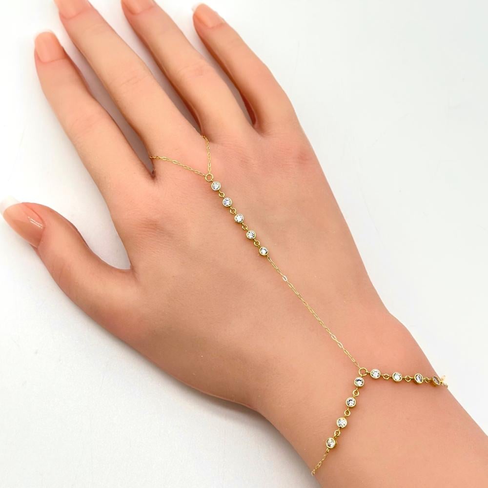 تميزي بكف ذهب عيار 18 بتصميم الماس ناعم، ينسدل برقة من المعصم إلى الإصبع بسلسلة ذهبية رفيعة تمنح اليد لمسة أنثوية دافئة. تتوزع فصوص الزركون بتناسق جذاب يعبّر عن الرومانسية والنعومة، لتكون القطعة المثالية لكل من تبحث عن الأناقة البسيطة مع لمسة مبهرة في تفاصيلها.