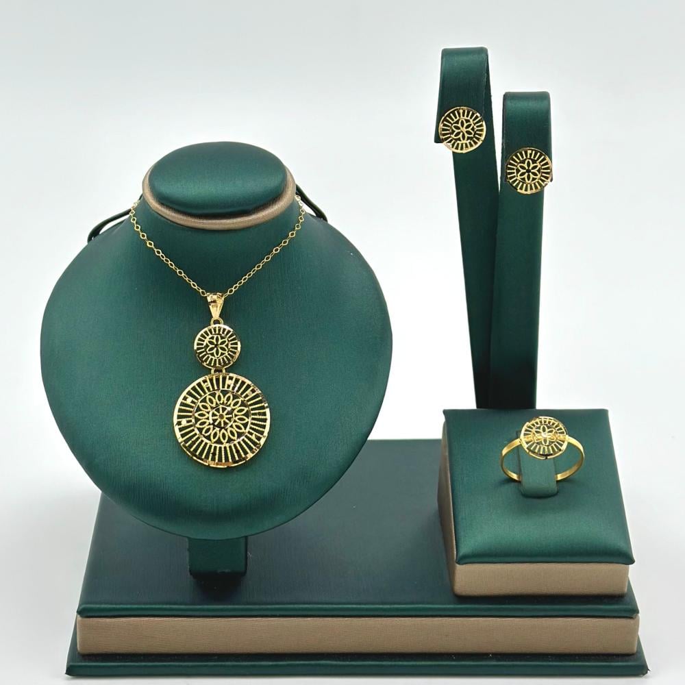 إن اللمعان الذهبي الرائع الذي يتمتع به نصف طقم الذهب عيار 21 يجذب الأنظار ويعكس تألقه الفريد. يتلألأ الذهب الخالص بجماله المتلألئ تحت أشعة الشمس والإضاءة، مما يضفي على الطقم سحرًا لا يقاوم.