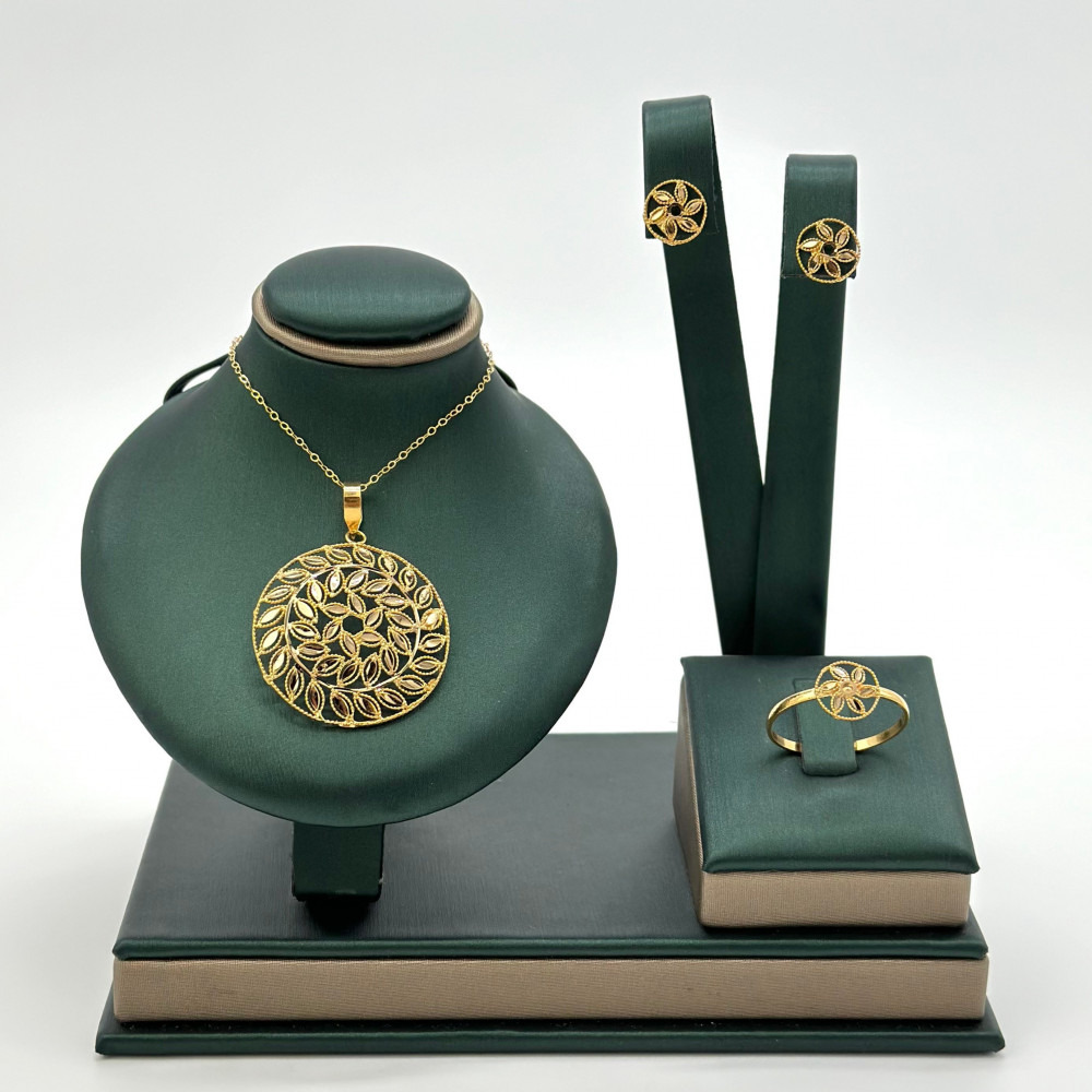 إن اللمعان الذهبي الرائع الذي يتمتع به نصف طقم الذهب عيار 21 يجذب الأنظار ويعكس تألقه الفريد. يتلألأ الذهب الخالص بجماله المتلألئ تحت أشعة الشمس والإضاءة، مما يضفي على الطقم سحرًا لا يقاوم.