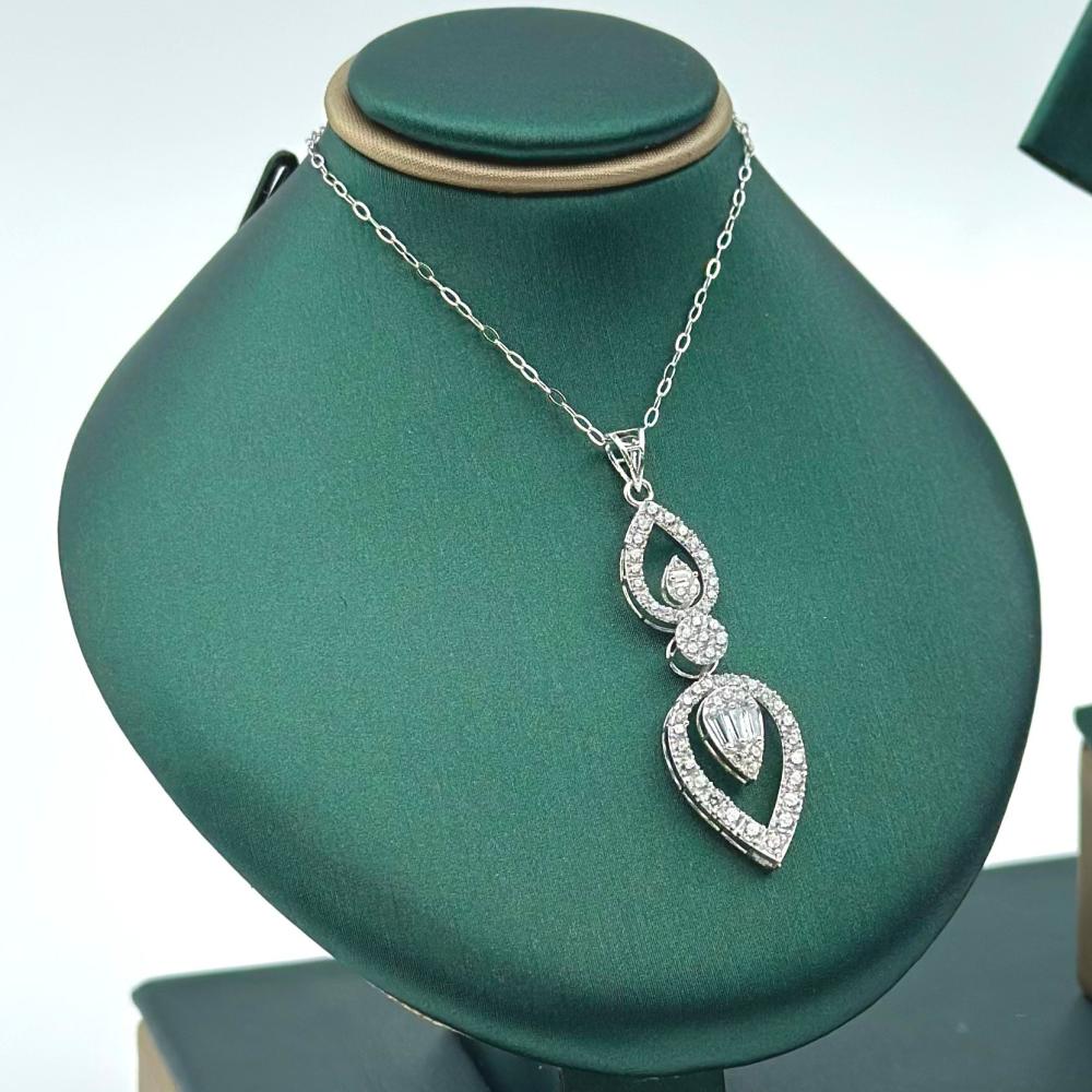 نصف طقم من مجوهرات الشلوي، مصنوع من ذهب أبيض عيار 18، يضفي على إطلالتك لمسة من الأناقة والرومانسية. تتألق فصوص الزركون وقصات الباقييت بتصميم يحاكي جمال الورود المتفتحة، تزينها قطرات أنيقة تضيف سحرًا وجاذبية، مما يجعلك تتألقين بجمال طبيعي وفريد في كل مناسبة.