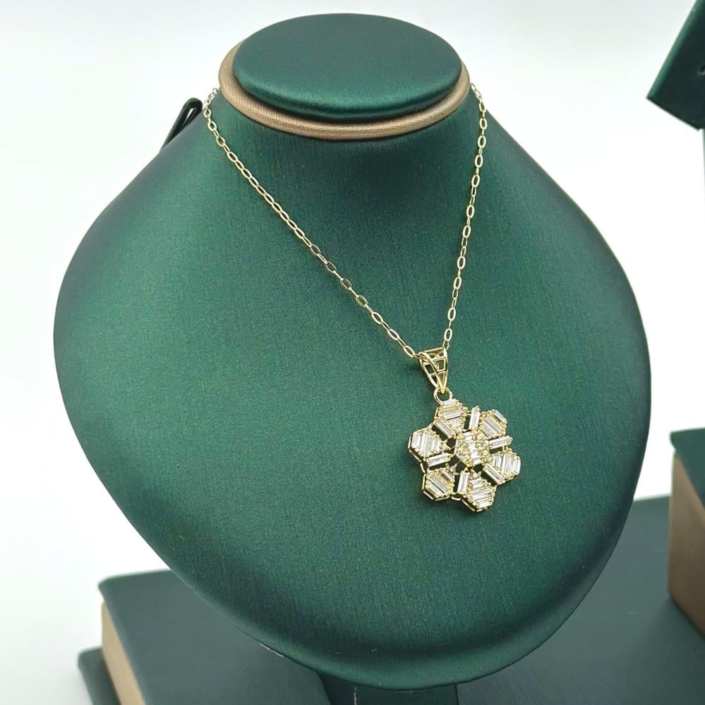 نصف طقم من مجوهرات الشلوي، مصنوع من ذهب اصفر عيار 18، يضفي على إطلالتك لمسة من الأناقة والرومانسية. تتألق فصوص الزركون وقصات الباقييت بتصميم يحاكي جمال الورود المتفتحة، تزينها قطرات أنيقة تضيف سحرًا وجاذبية، مما يجعلك تتألقين بجمال طبيعي وفريد في كل مناسبة.