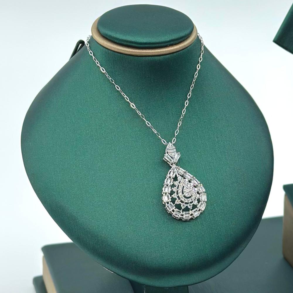 نصف طقم من مجوهرات الشلوي، مصنوع من ذهب أبيض عيار 18، يضفي على إطلالتك لمسة من الأناقة والرومانسية. تتألق فصوص الزركون وقصات الباقييت بتصميم يحاكي جمال الورود المتفتحة، تزينها قطرات أنيقة تضيف سحرًا وجاذبية، مما يجعلك تتألقين بجمال طبيعي وفريد في كل مناسبة.