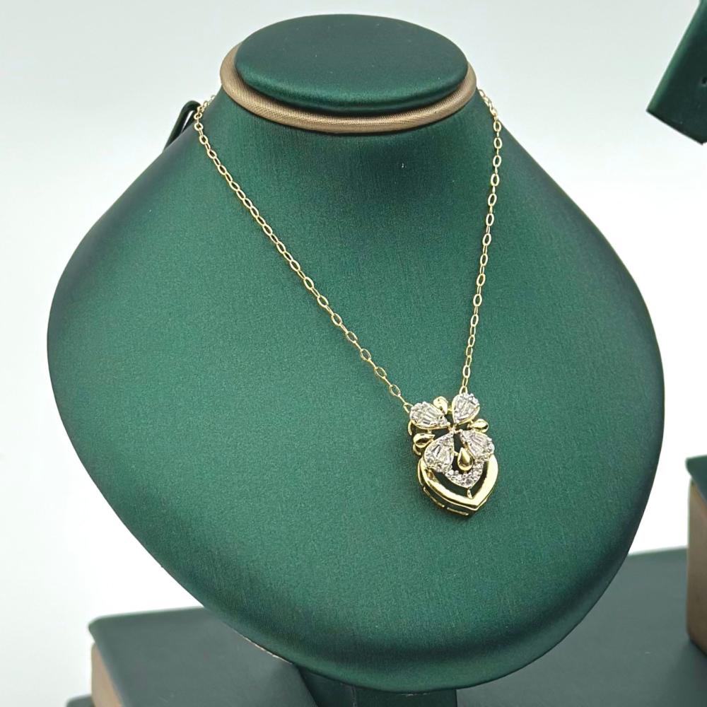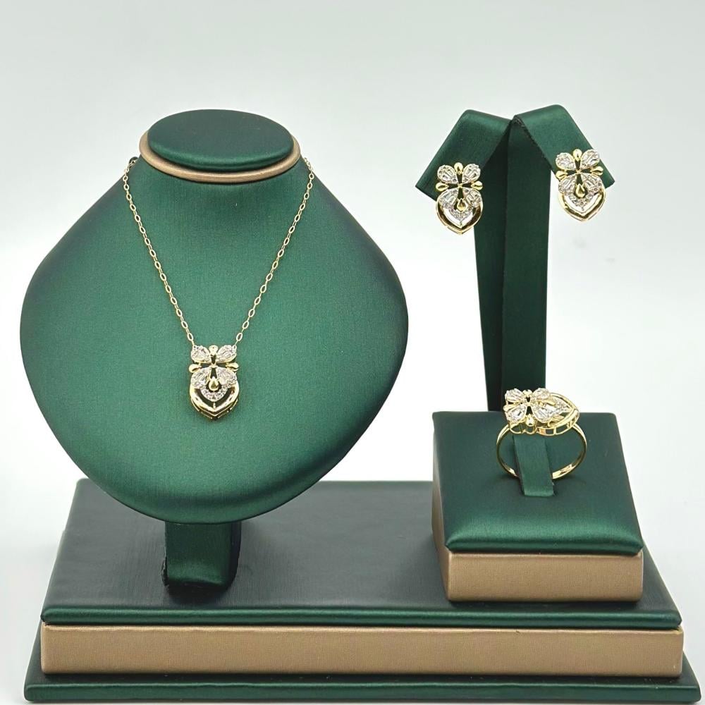 نصف طقم من مجوهرات الشلوي، مصنوع من ذهب اصفر عيار 18، يضفي على إطلالتك لمسة من الأناقة والرومانسية. تتألق فصوص الزركون وقصات الباقييت بتصميم يحاكي جمال الورود المتفتحة، تزينها قطرات أنيقة تضيف سحرًا وجاذبية، مما يجعلك تتألقين بجمال طبيعي وفريد في كل مناسبة.