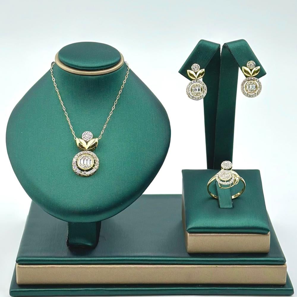نصف طقم من مجوهرات الشلوي، مصنوع من ذهب اصفر عيار 18، يضفي على إطلالتك لمسة من الأناقة والرومانسية. تتألق فصوص الزركون وقصات الباقييت بتصميم يحاكي جمال الورود المتفتحة، تزينها قطرات أنيقة تضيف سحرًا وجاذبية، مما يجعلك تتألقين بجمال طبيعي وفريد في كل مناسبة.