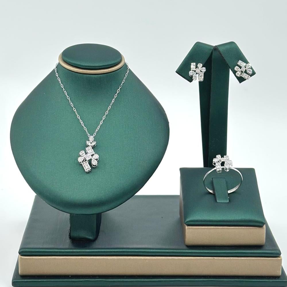 نصف طقم من مجوهرات الشلوي، مصنوع من ذهب أبيض عيار 18، يضفي على إطلالتك لمسة من الأناقة والرومانسية. تتألق فصوص الزركون وقصات الباقييت بتصميم يحاكي جمال الورود المتفتحة، تزينها قطرات أنيقة تضيف سحرًا وجاذبية، مما يجعلك تتألقين بجمال طبيعي وفريد في كل مناسبة.