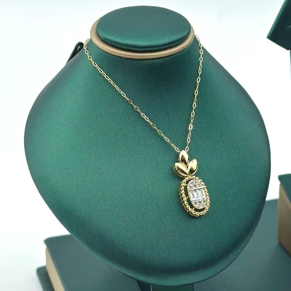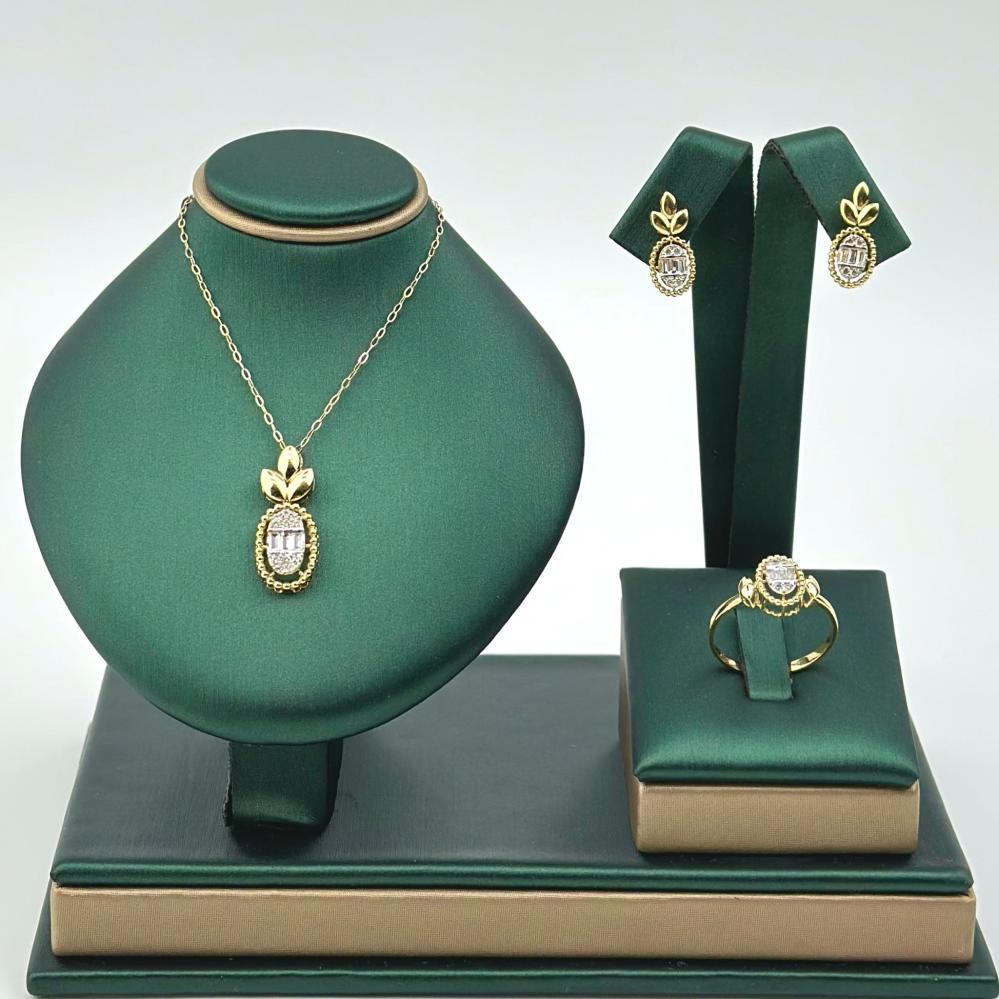 نصف طقم من مجوهرات الشلوي، مصنوع من ذهب اصفر عيار 18، يضفي على إطلالتك لمسة من الأناقة والرومانسية. تتألق فصوص الزركون وقصات الباقييت بتصميم يحاكي جمال الورود المتفتحة، تزينها قطرات أنيقة تضيف سحرًا وجاذبية، مما يجعلك تتألقين بجمال طبيعي وفريد في كل مناسبة.