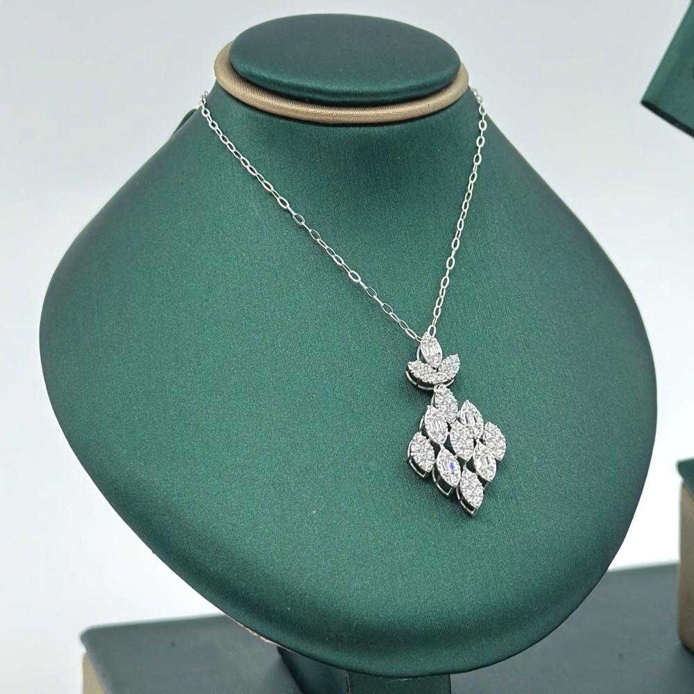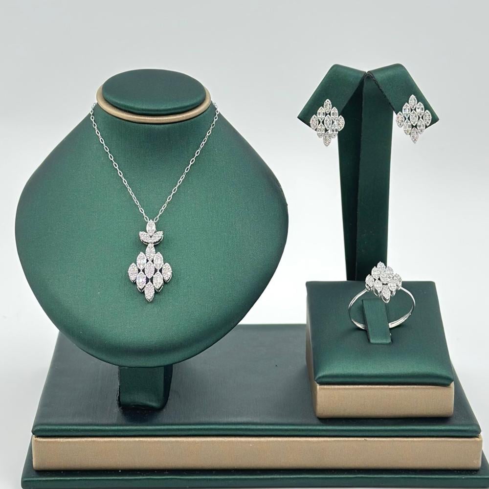 نصف طقم من مجوهرات الشلوي، مصنوع من ذهب أبيض عيار 18، يضفي على إطلالتك لمسة من الأناقة والرومانسية. تتألق فصوص الزركون وقصات الباقييت بتصميم يحاكي جمال الورود المتفتحة، تزينها قطرات أنيقة تضيف سحرًا وجاذبية، مما يجعلك تتألقين بجمال طبيعي وفريد في كل مناسبة.