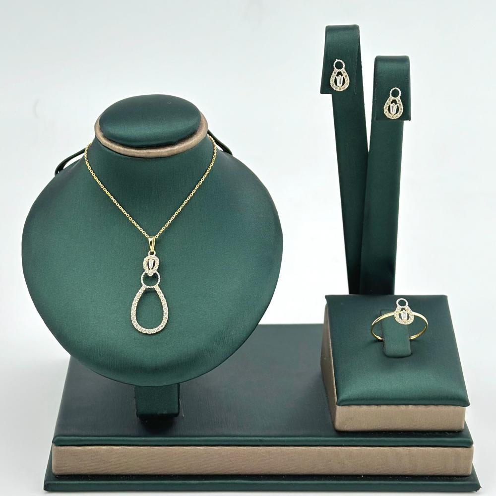يشع هذا الطقم بتناغم الذهب الأصفر الفاخر بتصميم الألماس اللامع، كأنه أغنية حب تلامس القلوب. السلسال بتعليقته الساحرة يتراقص على أنغام أنوثتك، والخاتم يتلألأ كنجمة في سماء يديك، والحلق يضيء بريقاً يخطف الأنظار. ارتدي هذا الطقم لتعيشي لحظات لا تنسى كأنها لحن جميل.