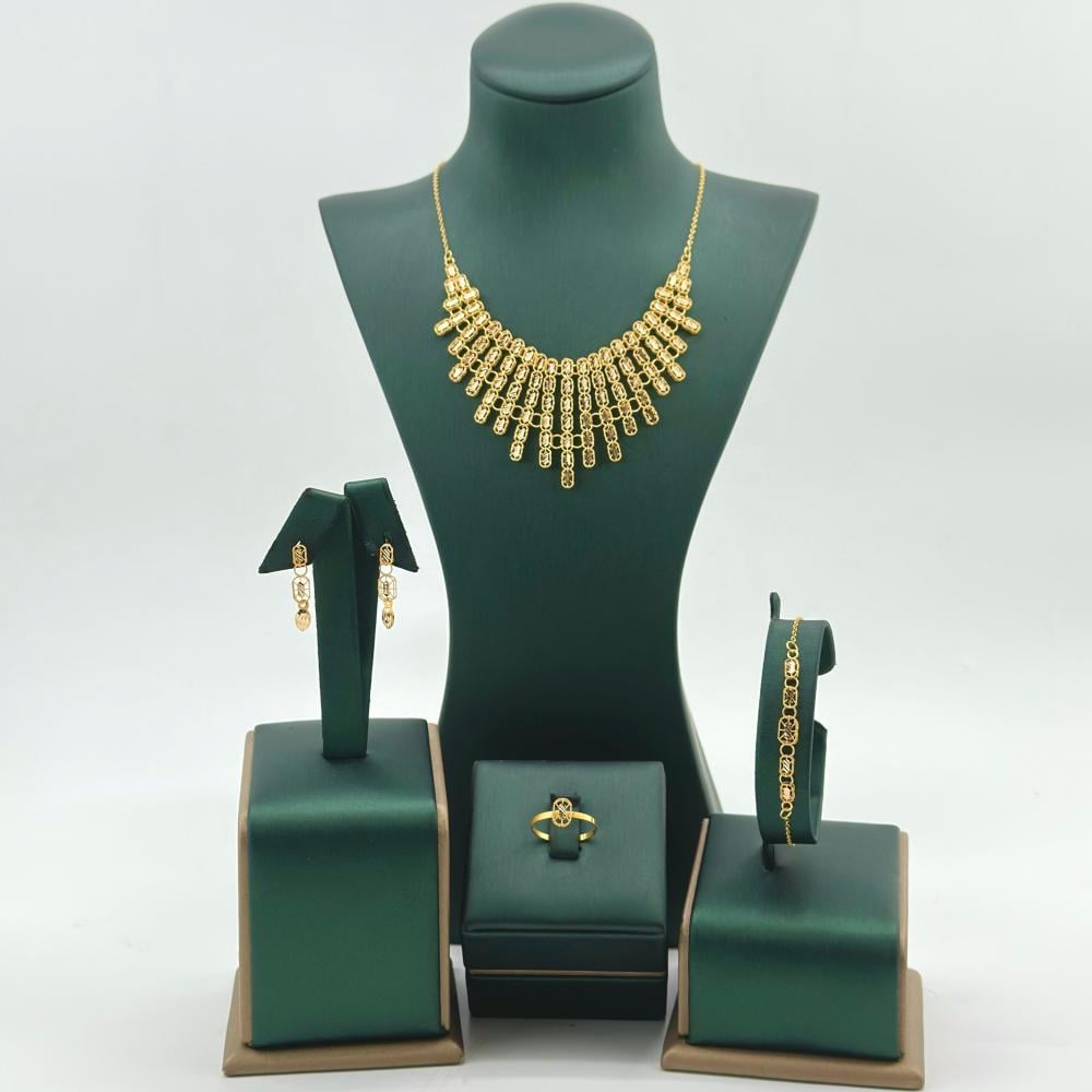 طقم ذهب عيار 21 هو مجموعة مجوهرات فاخرة ومتقنة التصميم، تعكس الفخامة والأنوثة بأدق التفاصيل. يتكون الطقم من قلادة، أقراط، خاتم، وأسورة، جميعها مصممة لتبرز جمال الذهب الأصفر وتضفي لمسة من الرقي.