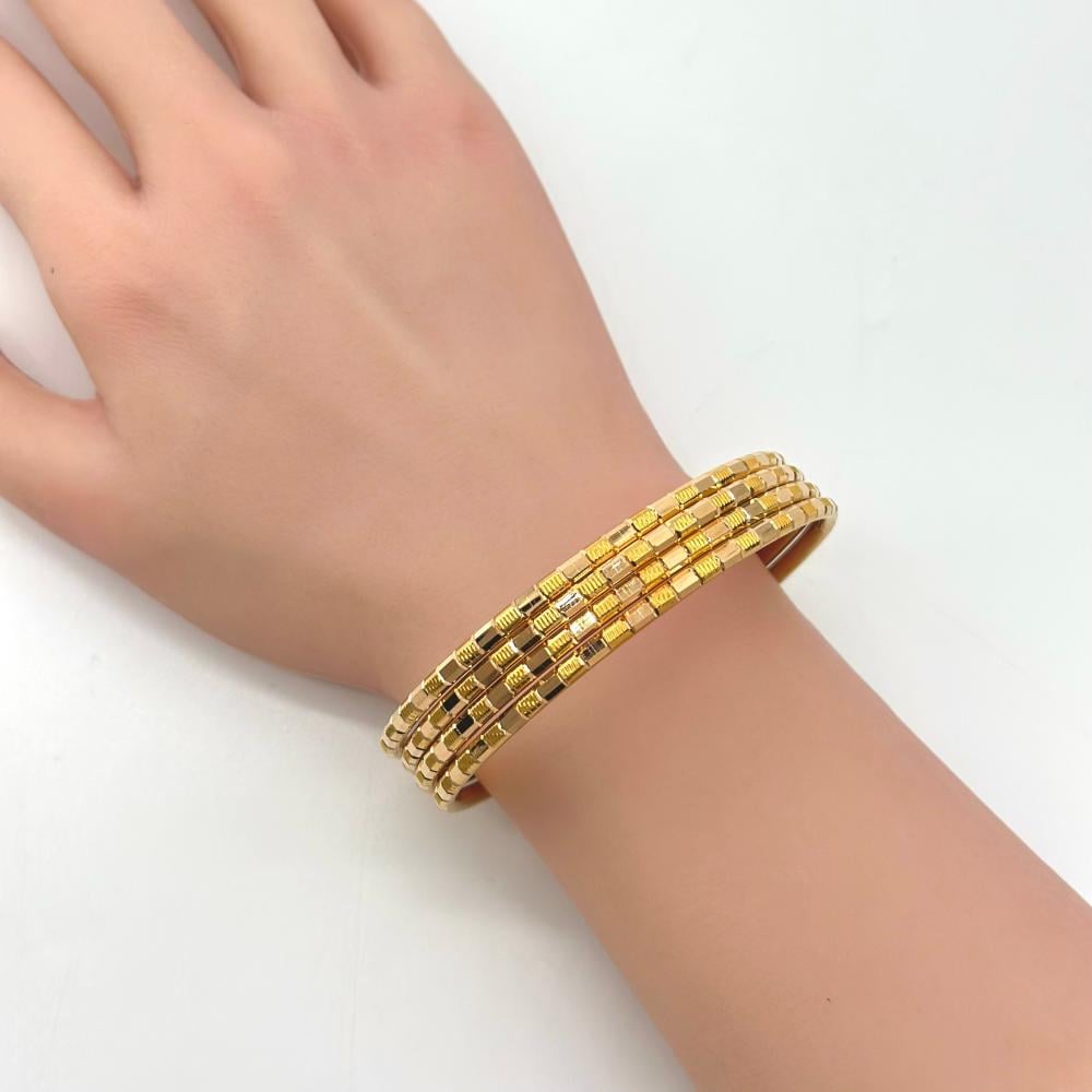 غوايش ذهبية أنيقة مصاغة بإتقان من ذهب عيار 21 الخالص، تأتي بتصميم مميز يشبه الشبكة الذهبية الدقيقة، حيث تتشابك الوصلات الصغيرة لتكوّن نمطًا هندسيًا أنيقًا يشبه النسيج المعدني الفاخر. يجمع التصميم بين السطح اللامع الذي يعكس الضوء ببريق مميز، واللمسة المطفية التي تُضفي عمقًا وأناقة هادئة للتفاصيل.