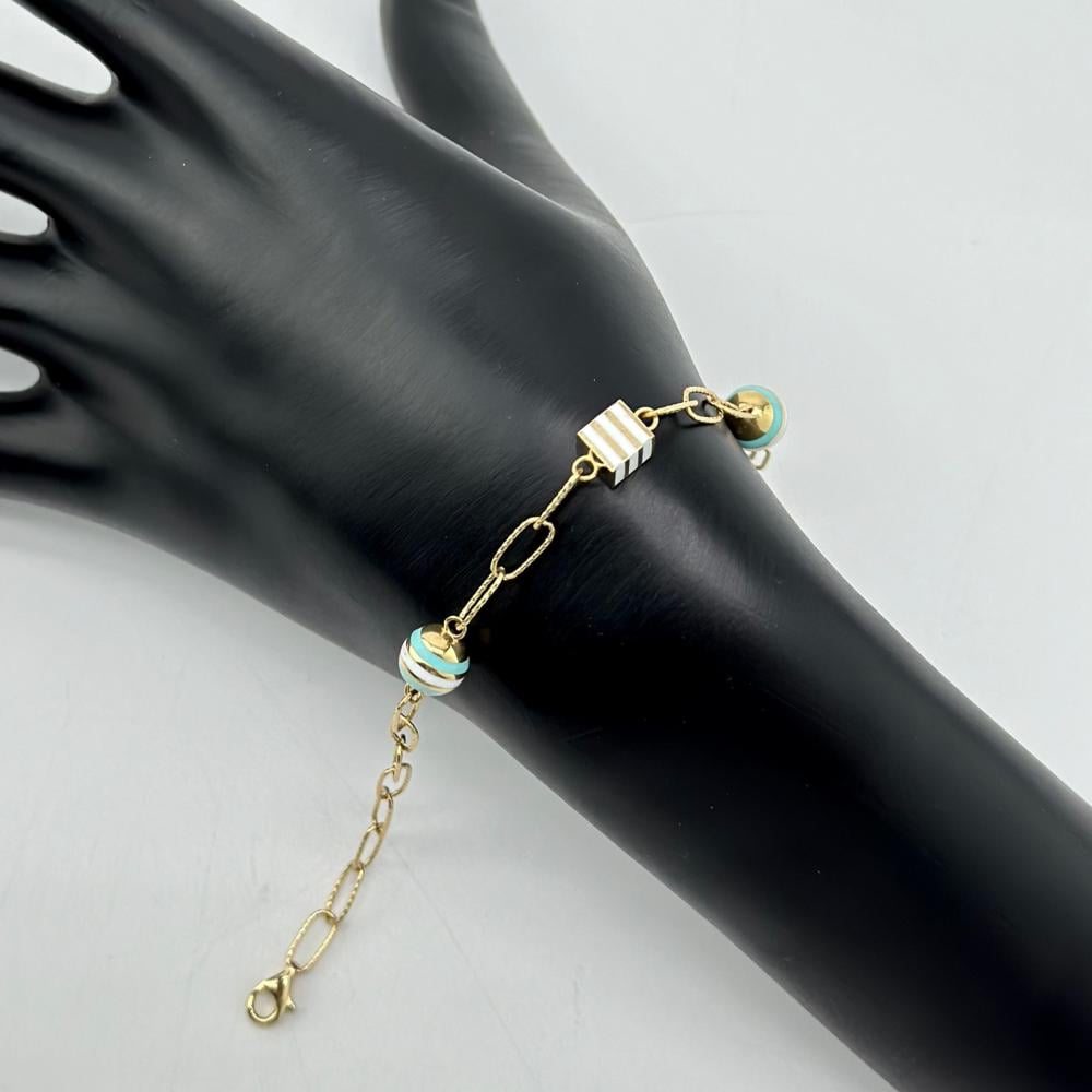بفضل تركيبتها الدقيقة وتفاصيلها الرائعة، تضفي هذه الإسوارة لمسة من الأناقة والجمال الخالص على معصمك، حيث تمزج بين سحر الذهب عيار 18 و اشكال هندسية بالوان المينا الزاهية.✨