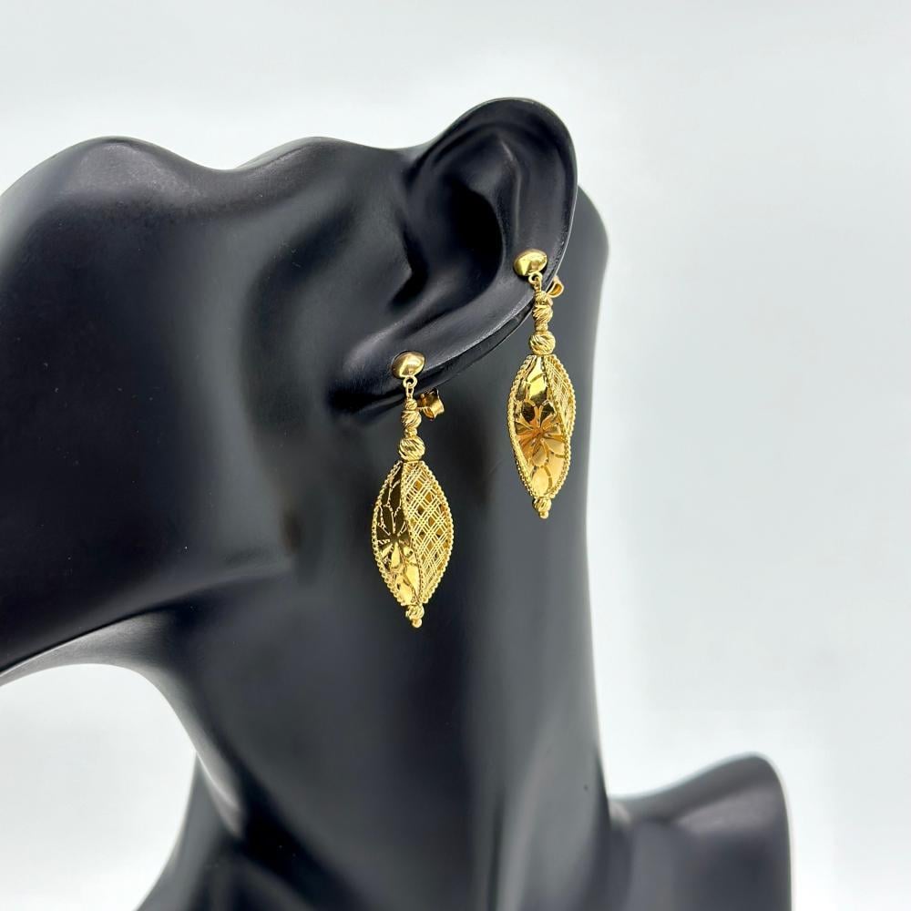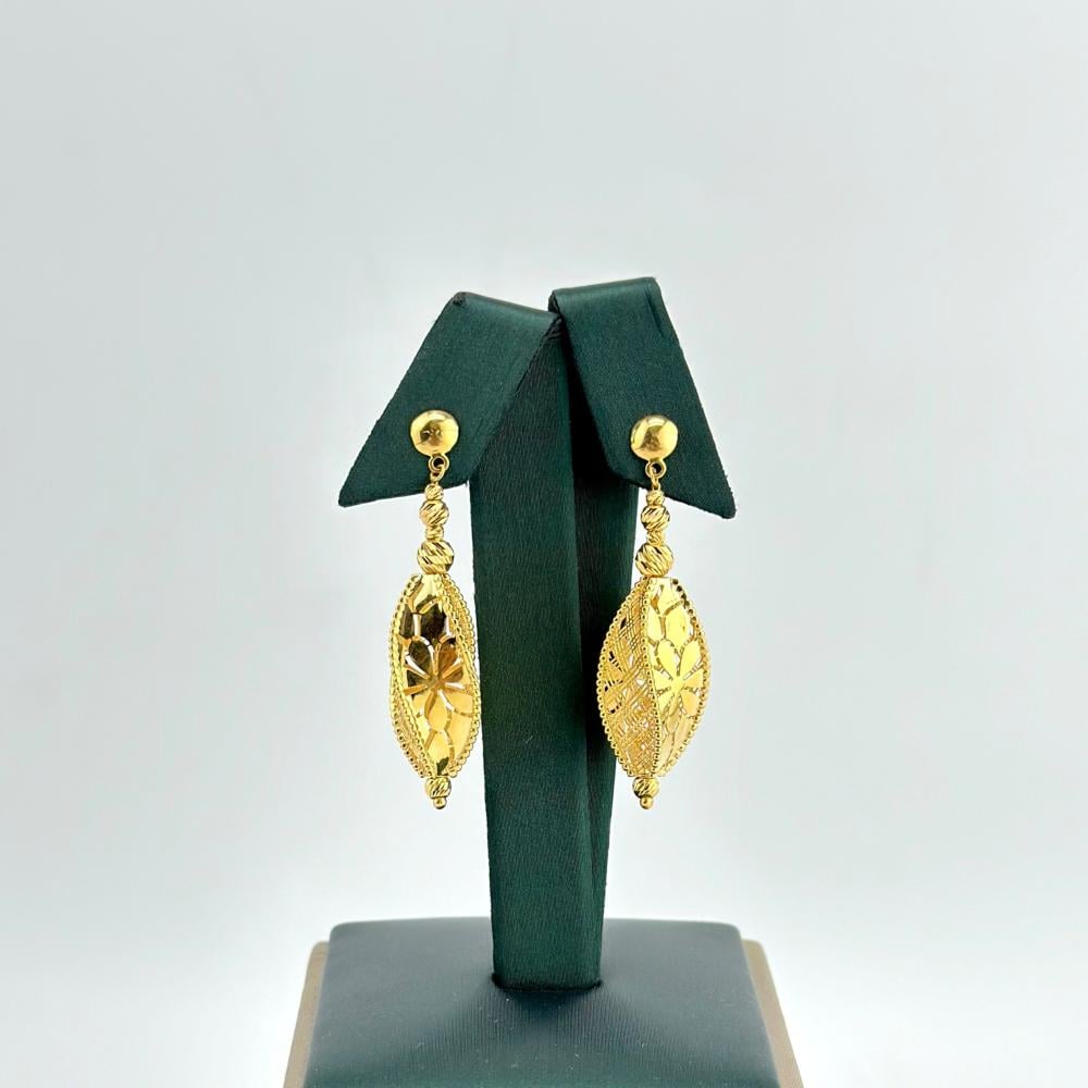 حلق ذهب أصفر عيار 21 من مجوهرات الشلوي يأتي بتصميم مميز يعكس بساطة وجمال الطبيعة من خلال تفاصيله الدقيقة على شكل الورود، كما أنه مطعّم بكرات الليزر اللامعة التي تضيف لمسة عصرية وأنيقة.