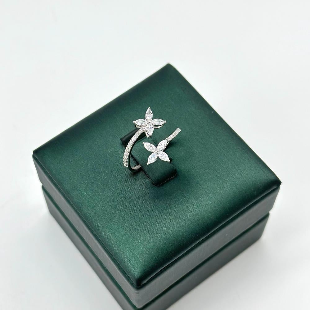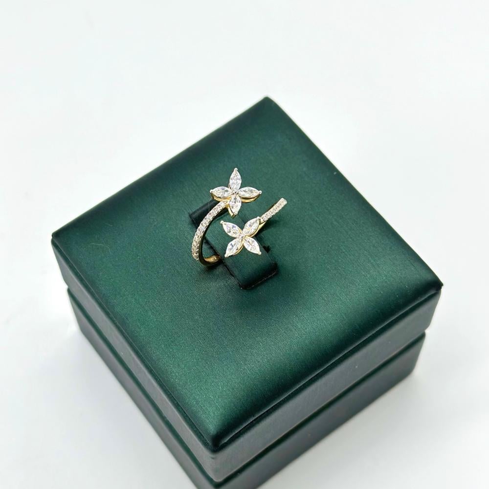 خاتم الورود الملكي: بتصميمه الساحر الذي يحمل وردتين أنيقتين متماثلتين بفصوص من قصات الماركيز المتلألئة. يجسد هذا الخاتم جمال الطبيعة بفخامتها ليكون رمزاً للرقي والأناقة الخالدة.