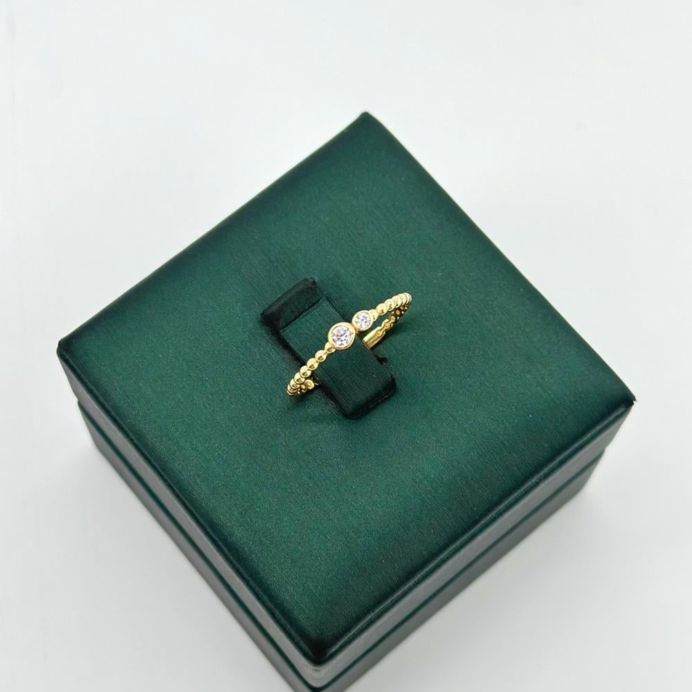 خاتم من الذهب الأصفر عيار 18 بتصميم بسيط وأنيق، مطعّم بفصوص الزريكون اللامعة. يجمع هذا الخاتم بين الحداثة والفخامة في قطعة واحدة، ليضفي لمسة من الحيوية والأناقة على يدك، ويكمل إطلالتك بأسلوب عصري ومميز.