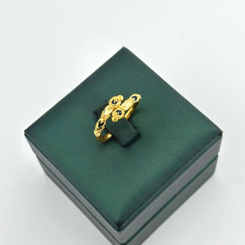 خاتم ذهبي عيار 21 بتصميم فاخر يحمل نقوشاً هندية تقليدية وزخارف مينا ملونة بألوان زاهية. هذا الخاتم يجسد براعة الفن الهندي العريق، ليضيف لمسة ساحرة من الفخامة والجمال الثقافي إلى إطلالتك.