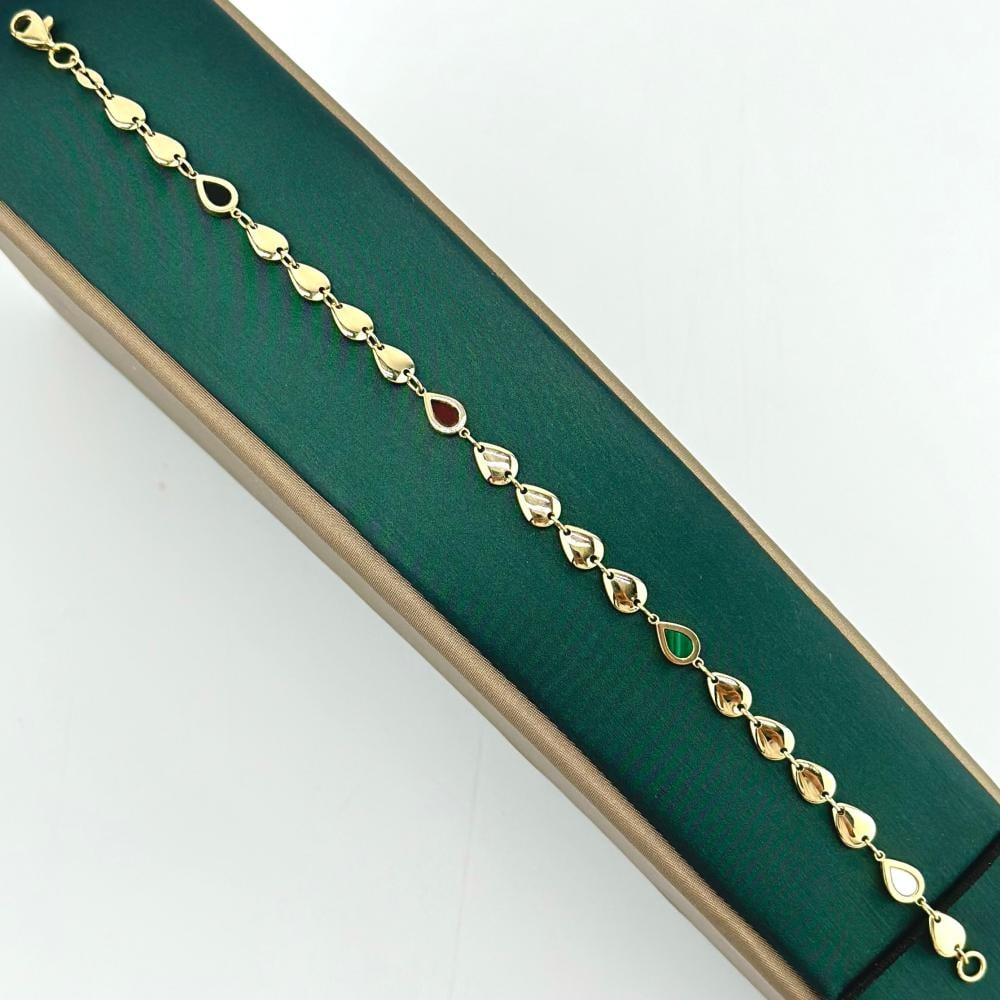 أسوارة من الذهب الأصفر عيار 18 من مجوهرات الشلوي، بتصميم دمعات ذهبية تنساب برقة حول معصمك، تضفي لمسة من النعومة والجمال. بعض الدمعات مطعّمة بأحجار صدفية ملونة تلتقط الضوء بألوانها الساحرة، مما يجعل هذه الأسوارة قطعة فريدة تعبر عن الأناقة المترفة والذوق الرفيع.