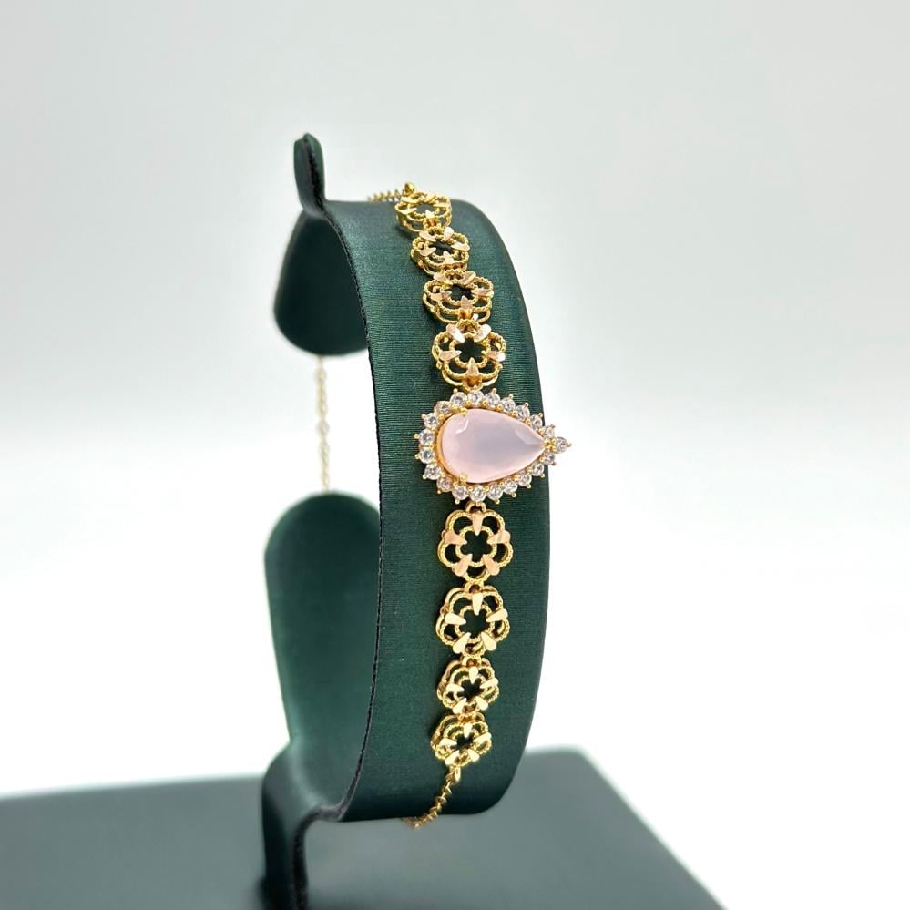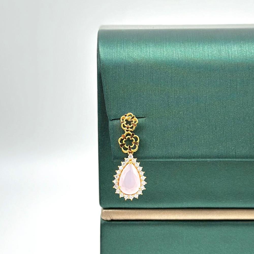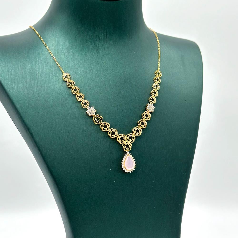 استمتع بجمال لا يضاهى مع هذا الطقم الذهبي المدهش عيار 21. كل قطعة منه تحاكي روعة الأنوثة وتبعث بريقًا لا مثيل له بفضل الزركون المتلألئ. الحجر الوردي الرقيق يتوسط الطقم ويضفي عليه لمسة من الرومانسية والسحر، كقلب ينبض بالحب والأناقة الراقية. التفاصيل المتقنة تجعل من هذا الطقم تعبيرًا عن الجاذبية الخالدة، معبأ بكل دفء وعاطفة لتكون كل لحظة تلبسه فيها لحظة خاصة ومميزة.✨
