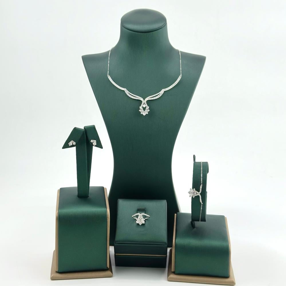 هذا الطقم من مجوهرات الشلوي ليس فقط مذهلاً من الناحية الجمالية، بل يحمل أيضًا قيمة مادية عالية. يعتبر الذهب الأبيض عيار 18 من بين الأنواع الأكثر طلبًا في عالم المجوهرات، حيث يجمع بين الأناقة والتميز والمتانة.