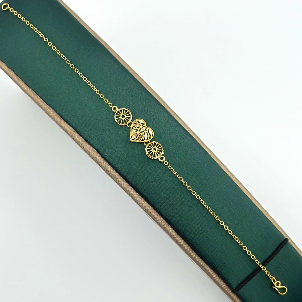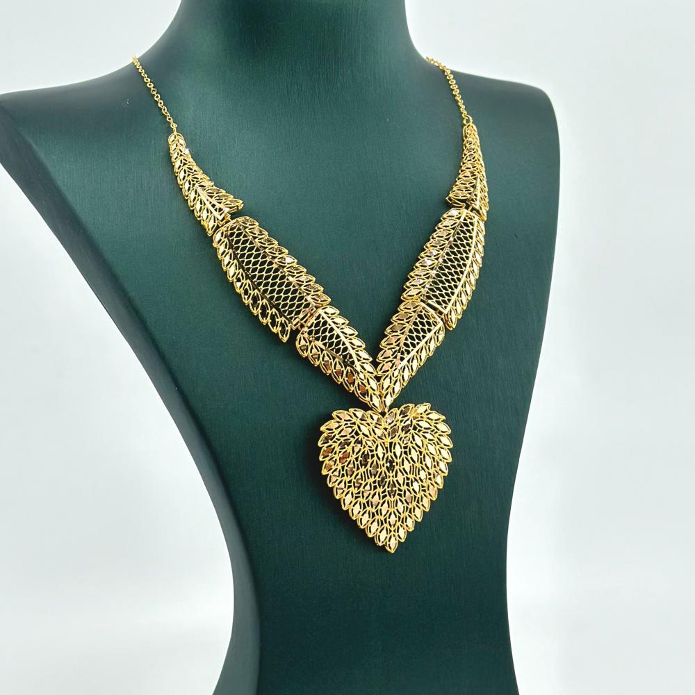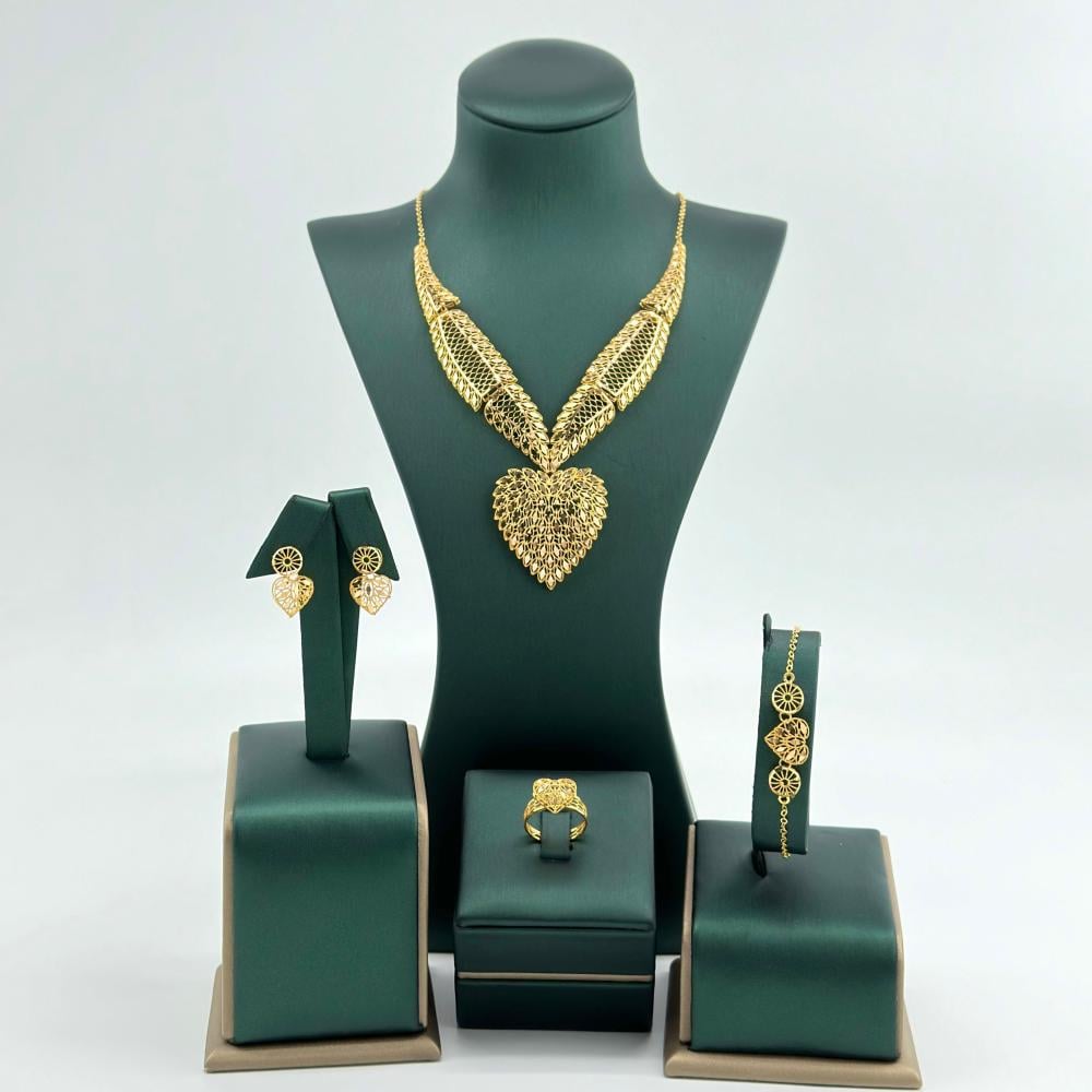 طقم ذهب أصفر عيار 21 من مجوهرات الشلوي بتصميم شرقي أنيق يحمل شكل القلب، يجمع بين الرومانسية والفخامة. يتكون الطقم من عقد ساحر، وأسورة أنيقة، وخاتم بديع، وحلق متألق. هذه المجموعة المتكاملة تبرز جمالك بلمسة شرقية راقية وتضفي على إطلالتك جاذبية لا تقاوم.
