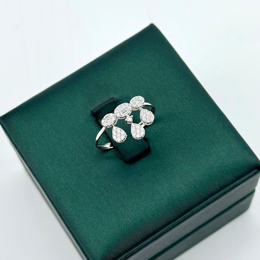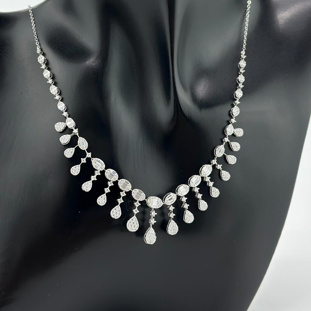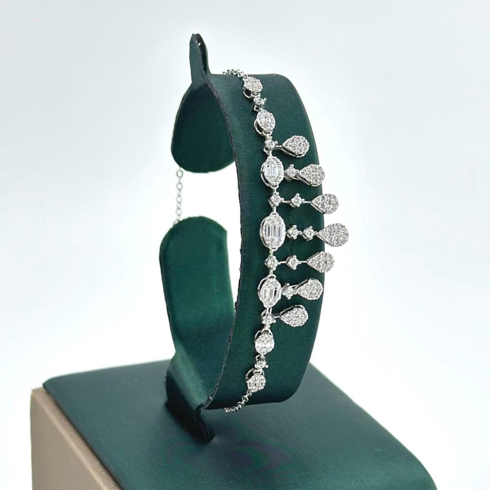 طقم الذهب الأبيض عيار 18 بتصميم أنيق، يزينه فصوص الزركون البراقة وقصات الباغيت اللامعة. يجمع هذا الطقم بين بريق الألماس ورونق الأشكال الأنيقة، ليضفي لمسة من السحر والرقي على إطلالتك. قطعة مثالية تعبر عن الفخامة والأنوثة بكل تفاصيلها.
