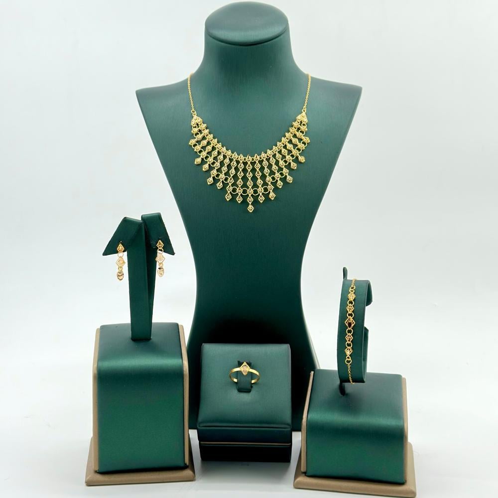 طقم ذهب عيار 21 هو مجموعة مجوهرات فاخرة ومتقنة التصميم، تعكس الفخامة والأنوثة بأدق التفاصيل. يتكون الطقم من قلادة، أقراط، خاتم، وأسورة، جميعها مصممة لتبرز جمال الذهب الأصفر وتضفي لمسة من الرقي.
