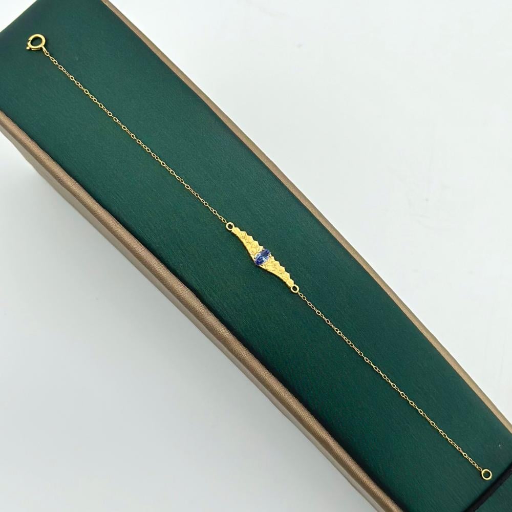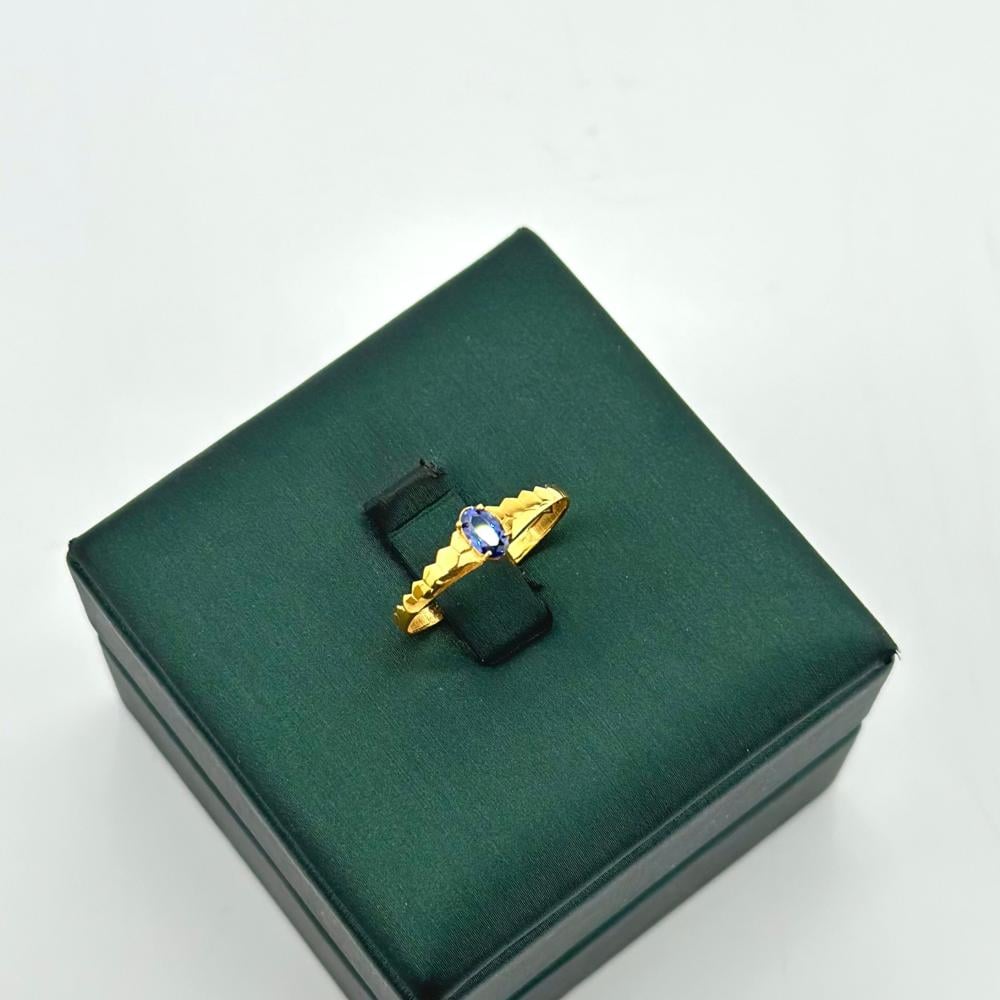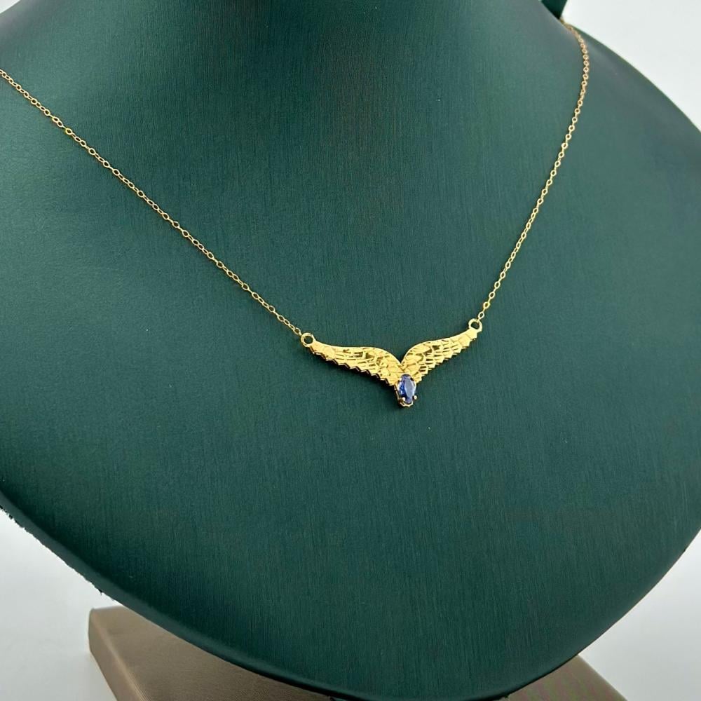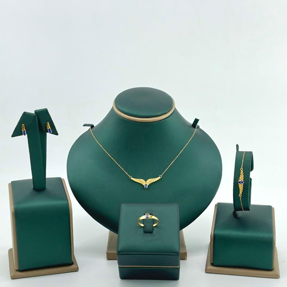 طقم "جناح الصقر " مصنوع من الذهب عيار 21, يتميز التصميم بدقة متناهية حيث تظهر تفاصيل الريش بشكل بارز ودقيق, منحوت بخطوط انسيابية تمنح الطقم مظهراً طبيعياً وحيوي, الأجنحة تنساب بإنحنائات ناعمة لتشكل قوساً انيقاً يعكس إحساساً بالحركة والطيران, يتوسط الطقم فص جميل على شكل بيضاوي باللون الكحلي.