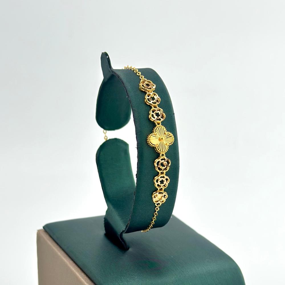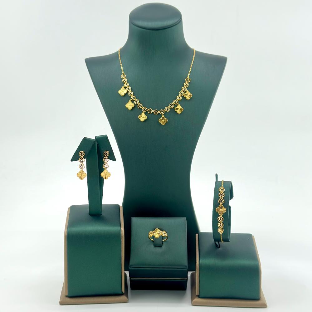 طقم ذهب عيار 21 بتصميم ماسي أنيق، مصنوع من الذهب الأصفر. يجمع هذا الطقم بين الفخامة والتميز، حيث يتألق كل قطعة بتفاصيلها الدقيقة ولمساتها الراقية، ليكون إضافة مثالية لإطلالتك في المناسبات الخاصة.