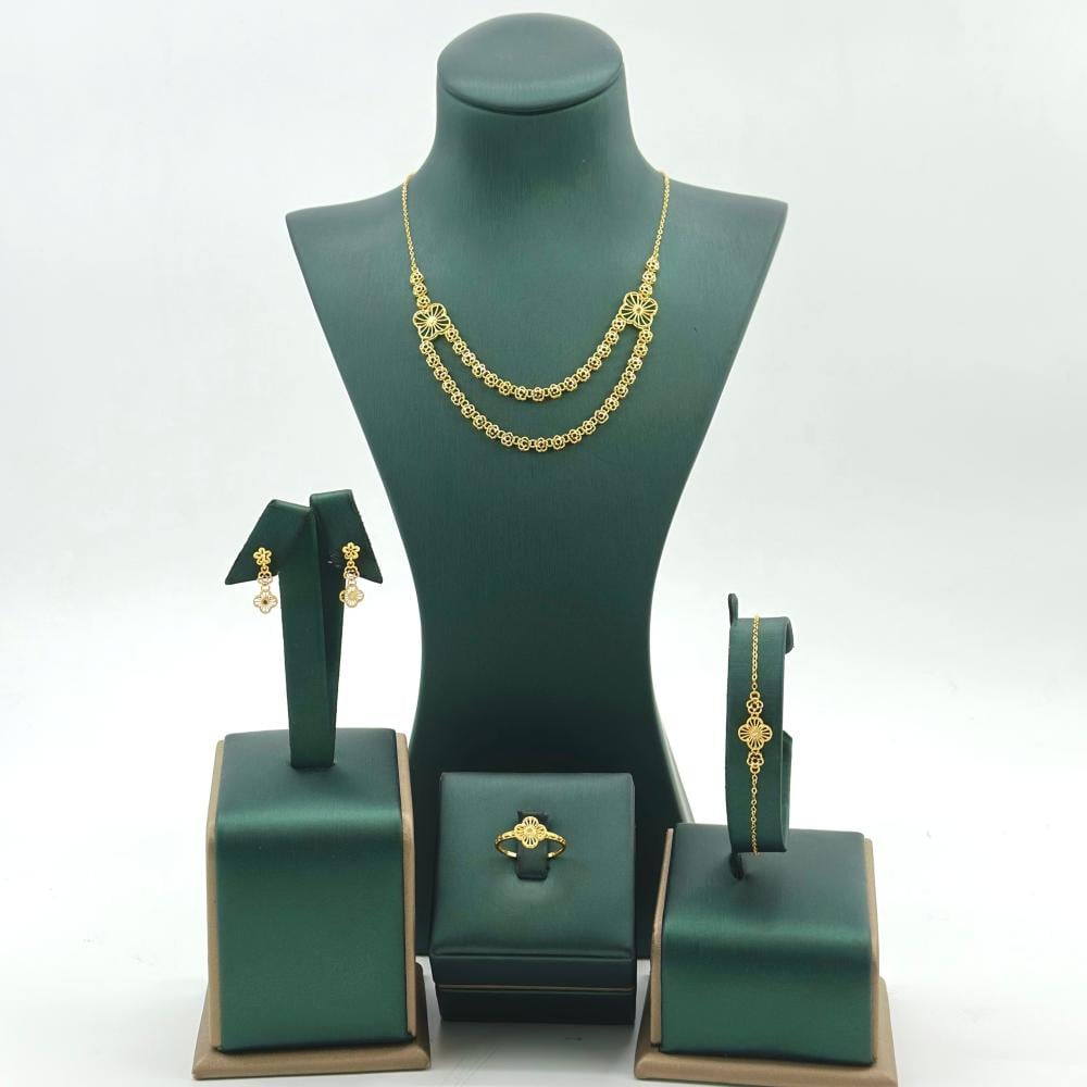 يتميز الطقم بتصميم يشبه وردة بديعة، حيث تم تفصيله بأناقة ورقي، مما يضفي عليه جمالاً استثنائياً ورونقاً خاصاً. يتكون الطقم من قطع اربع رئيسية، وهي عقد وخاتم وحلق و اسوارة، مما يجعله مجموعة متكاملة ومتناغمة تضيف لمسة أنيقة إلى أي إطلالة. وتعتبر قطع الطقم مصنوعة من ذهب عيار 21 عالي الجودة والصافي، حيث لا تحوي أي فصوص أو أحجار كريمة، مما يبرز جمالها الطبيعي ويضفي عليها بريقاً فريداً.