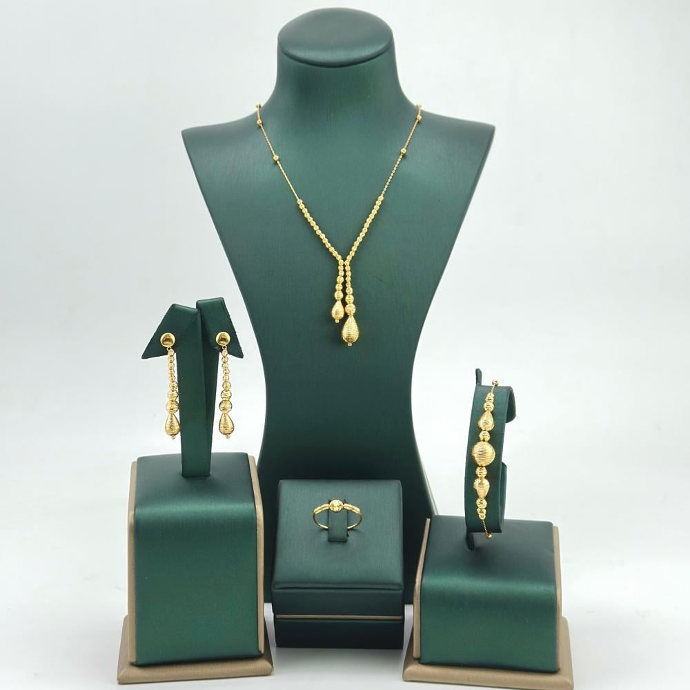 تألقي بإطلالة ملكية مع طقم مجوهرات الشلوي من ذهب أصفر عيار 21. يضم الطقم عقداً وأسوارة وخاتم وحلق، مزيناً بكرات النانو وتصاميم بيضاوية تضفي سحراً ورقياً فريداً. هذا الطقم الفاخر يجسد الفخامة والجمال، ليمنحك إطلالة استثنائية في كل مناسبة.
