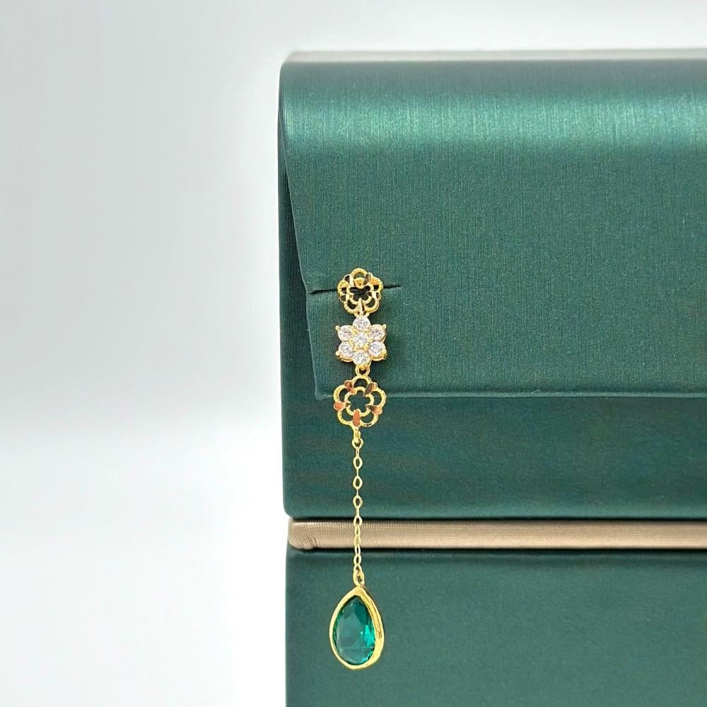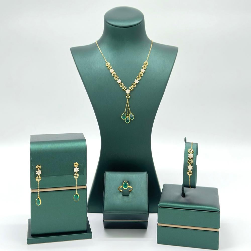 تألقي بأناقة مع هذا الطقم الذهبي الفاخر عيار 21، الذي يجمع بين روعة الورود الذهبية وسحر فصوص الزركون اللامعة. تتدلى منه أحجار خضراء بأشكال الدموع، تضفي لمسة من الجمال الخلاب ورونقًا ملكيًا. كل قطعة في هذا الطقم تعكس مزيجًا متناغمًا من الأنوثة والفخامة، لتروي قصة عشق خالدة. ارتديه لتستمتعي بجاذبية تأسر الأنظار والقلوب في آن واحد.