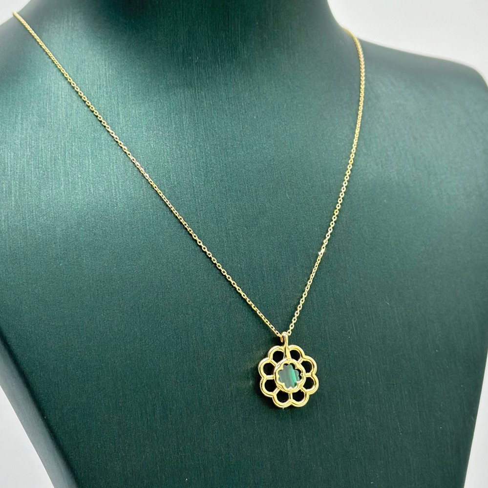يزيّن وسط العقد صدف أخضر صغير، يُضفي عليه لمسة من التميز والجمال الطبيعي. يمتاز العقد بتصميمه الأنيق الذي يشبه الوردة، مما يجعله مناسبًا لجميع المناسبات، من الإطلالات اليومية إلى المناسبات الرسمية.