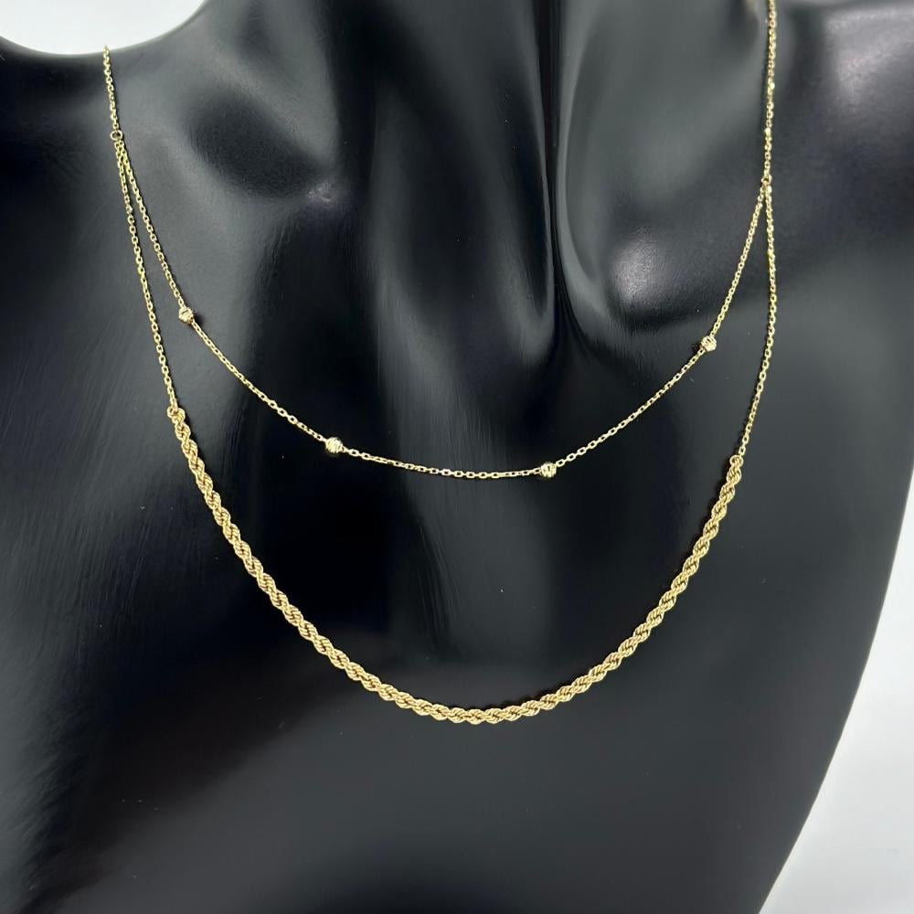 عقد رائع مصنوع من الذهب الأصفر عيار 18، يتميز بتصميم ذو طابقين. الطابق الأول مزين بتطعيمات من كرات الليزر اللامعة، بينما يحمل الطابق الثاني سلسال مبروم بأناقة. هذا العقد يجسد الحرفية الفائقة والفخامة، ليضفي لمسة من التألق والرقي على أي إطلالة، مثالي للمناسبات الخاصة أو لإضافة لمسة من الفخامة للأيام العادية.