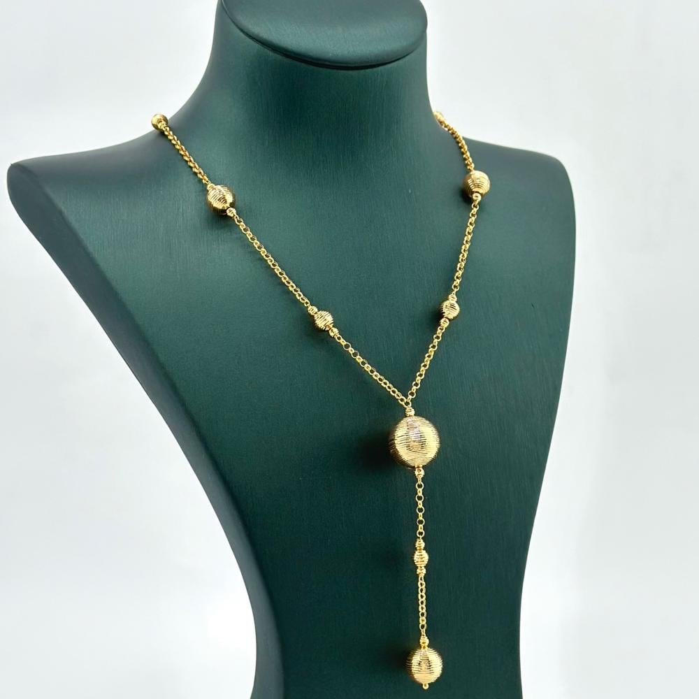 هذا العقد الذهبي عيار 21 تتناثر حوله كرات الليزر البراقة، يتوسطه شكل هندسي انيق لتعكس الضوء برقة وسحر، مما يضفي عليها بريقاً خاصاً يجذب الأنظار ويضفي لمسة من الأناقة العصرية.