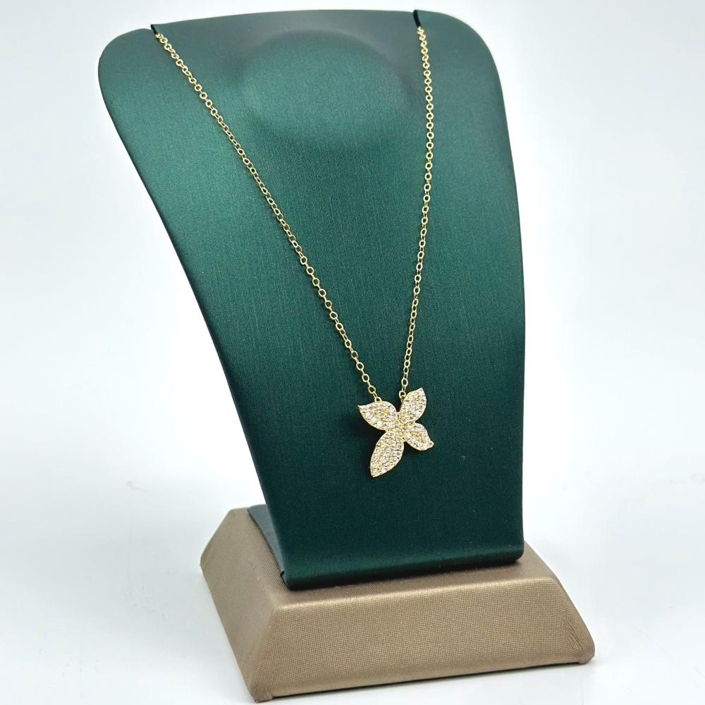 بفضل تركيبته الدقيقة وتفاصيله الرائعة، يضفي هذا العقد لمسة من الأناقة والجمال الخالص على عنقكِ، حيث يمزج بين سحر الذهب عيار 18 وبريق الزركون الأنيق بتصميم يشبه بريق الالماس بكل تفاصيله.