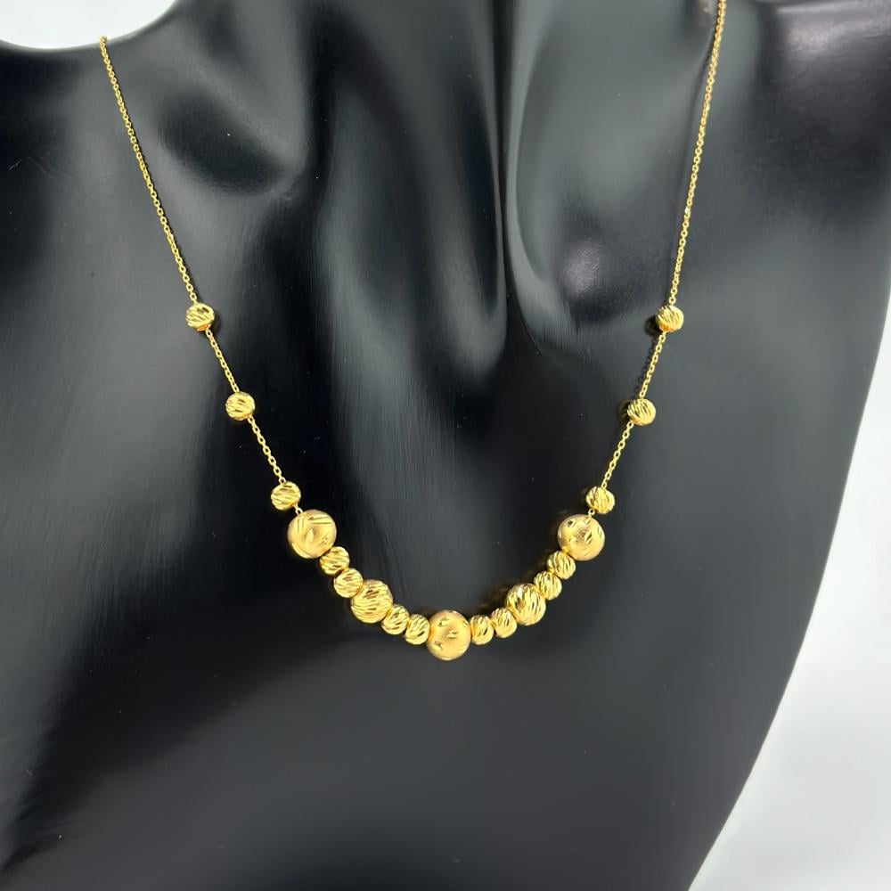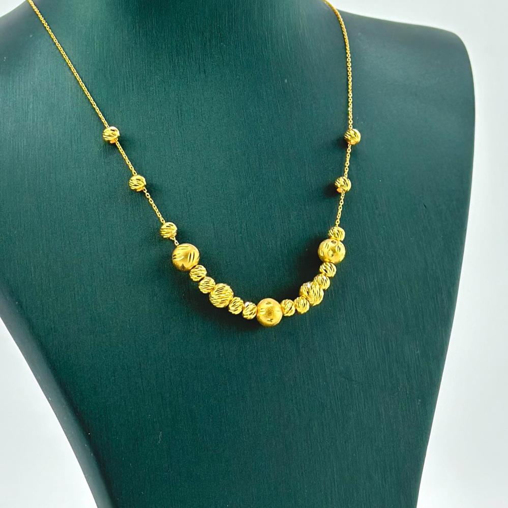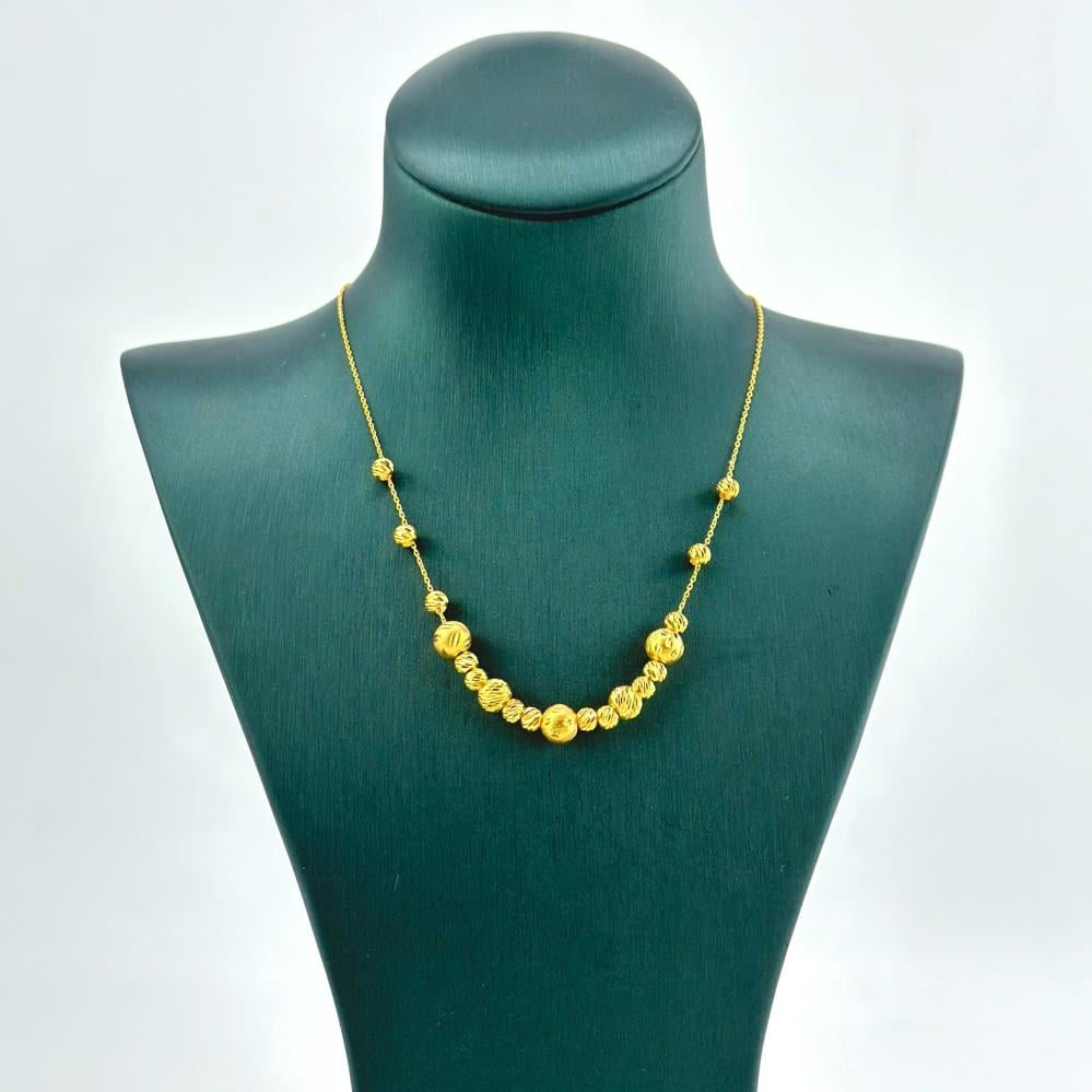 عقد من الذهب الأصفر عيار 21 يتألق بكرات الليزر المتلألئة، يمنحك بريقاً يخطف الأنظار في كل حركة. تصميم يعكس تميز الذهب ويضفي لمسة من الفخامة العصرية على إطلالتك، ليكون خياراً مثالياً لكل لحظة خاصة.