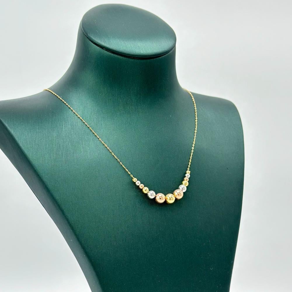 يتزين هذا العقد الرائع بكرات ذهبية تتناغم بانسيابية على قلبه، مشعة ببريق يخطف الأنظار. تصميمه الدائري الأنيق يعبر عن جمال لا مثيل له، حيث تتوزع الكرات بترتيب فني يجسد الروعة والتألق. هذا العقد يمثل قطعة فريدة تضفي لمسة من السحر والجاذبية على أي إطلالة.✨