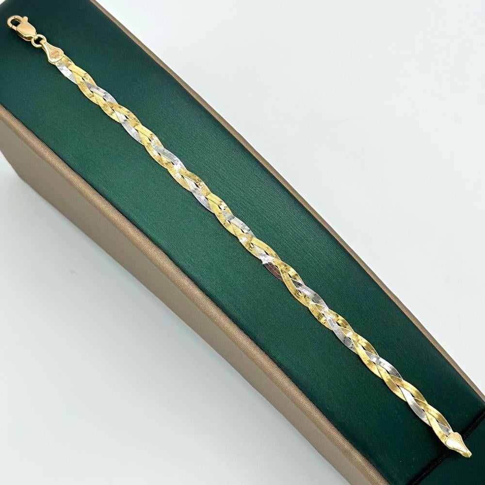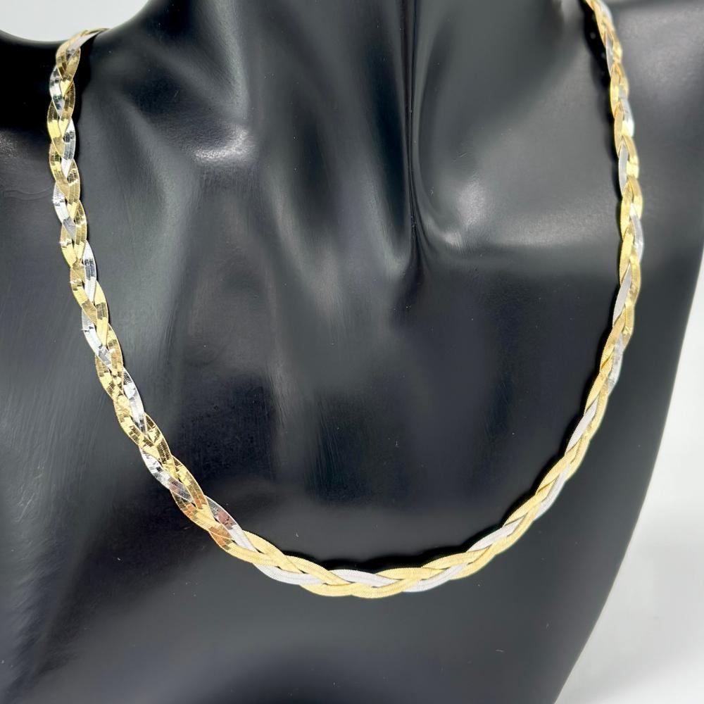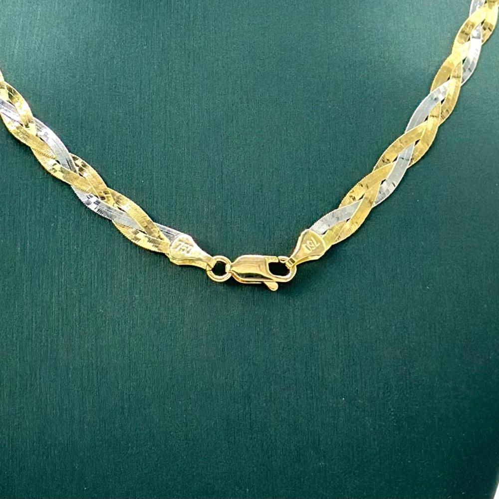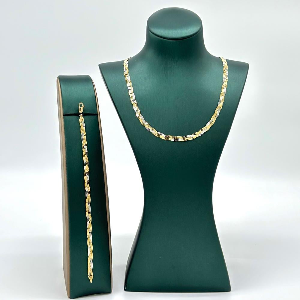 استمتعي بسحر الأناقة الكلاسيكية مع هذا الطقم الراقي من الذهب عيار 18، الذي يضم عقداً وأسوارة بتصميم مجدول بألوان الذهب الأصفر والأبيض. يبرز الطقم بتفاصيله البديعة وأقفاله الفريدة، ليضفي لمسة من الفخامة والرقي على كل مناسبة.✨