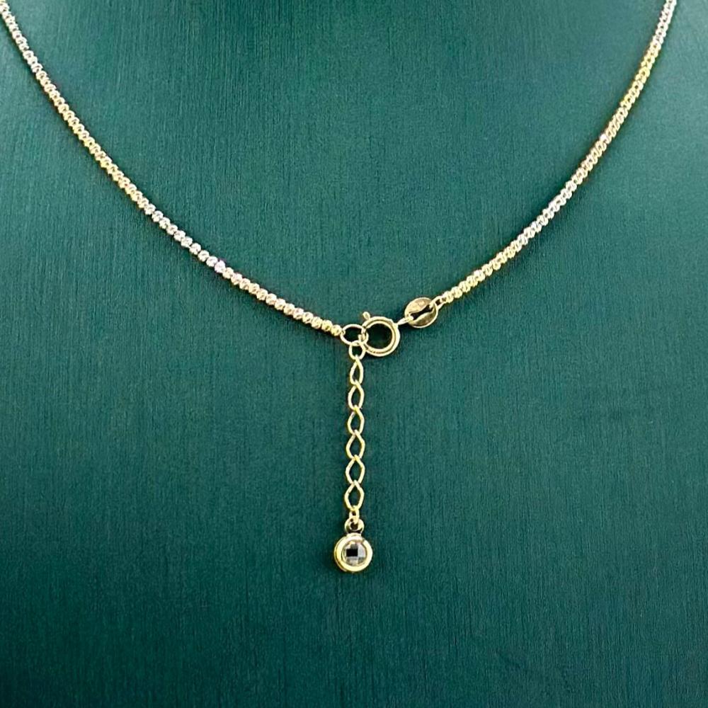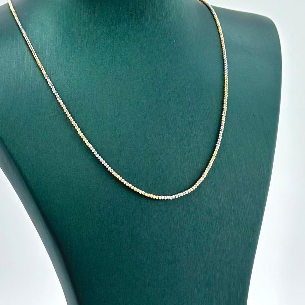تألقي بإطلالة فاخرة مع طقم العقد والأسوارة من الذهب عيار 18 من مجوهرات الشلوي. يتميز هذا الطقم بتصميمه الذي يجمع كرات الليزر بين لونين ساحرين: الذهب الأصفر والذهب الأبيض. تنساب كرات الذهب بانسيابية لتشكل تحفة فنية تعكس أناقتك وجمالك، مما يضفي على إطلالتك لمسة من الرقي والتألق في كل مناسبة.