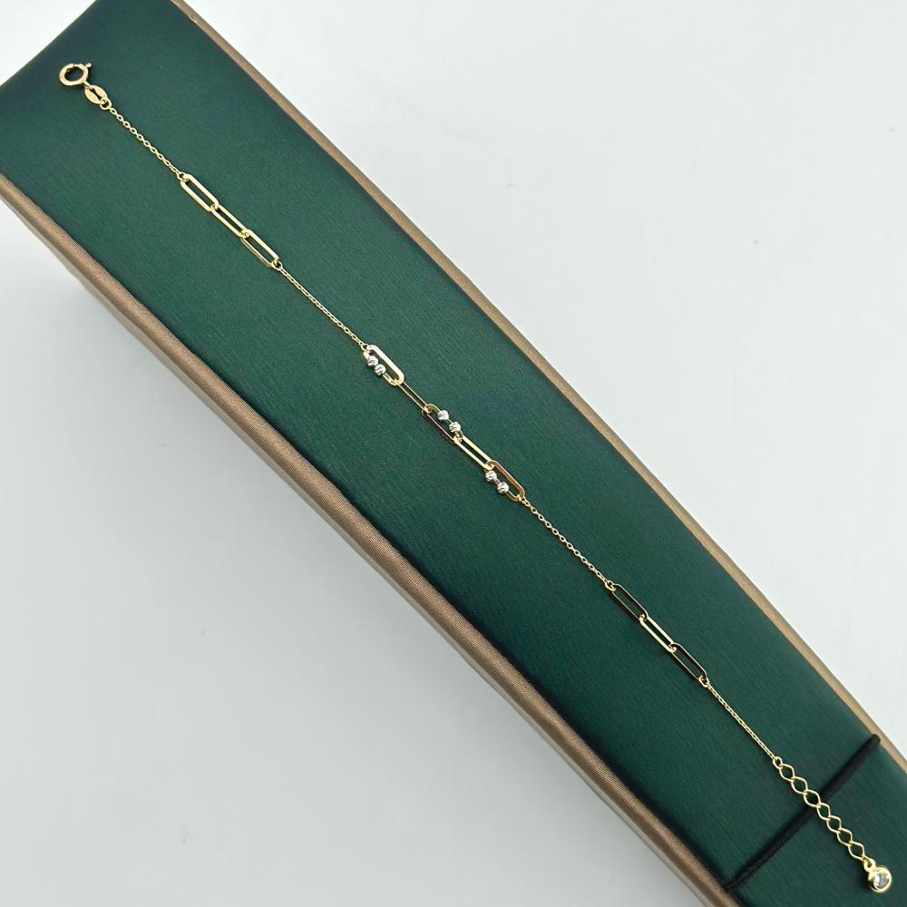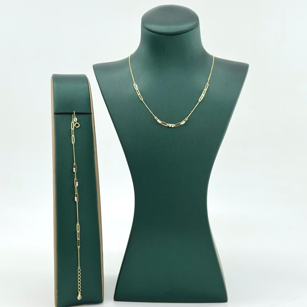 تألقي بطقم فاخر من الذهب عيار 18، يتألف من عقد وأسوارة مصممان بأناقة تحمل أشكال هندسية ذهبية متقنة الصنع. هذا الطقم المثالي يبرز جمالك في كل مناسبة، ويضفي لمسة من الرقي على إطلالتك.