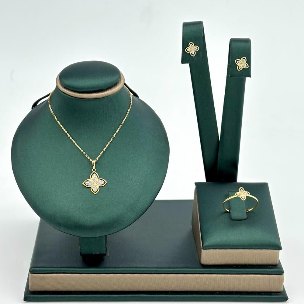 نصف طقم ذهب عيار 18 على شكل وردة بتصميم ماسي أنيق، مزين بفصوص الزركون المتألقة. يتكون النصف طقم من سلسال بتعليقة وردة، خاتم وحلق متناسقين. يجمع هذا التصميم بين الرقي والفخامة، ليضفي لمسة من الأنوثة والجاذبية على إطلالتك في كل مناسبة.✨