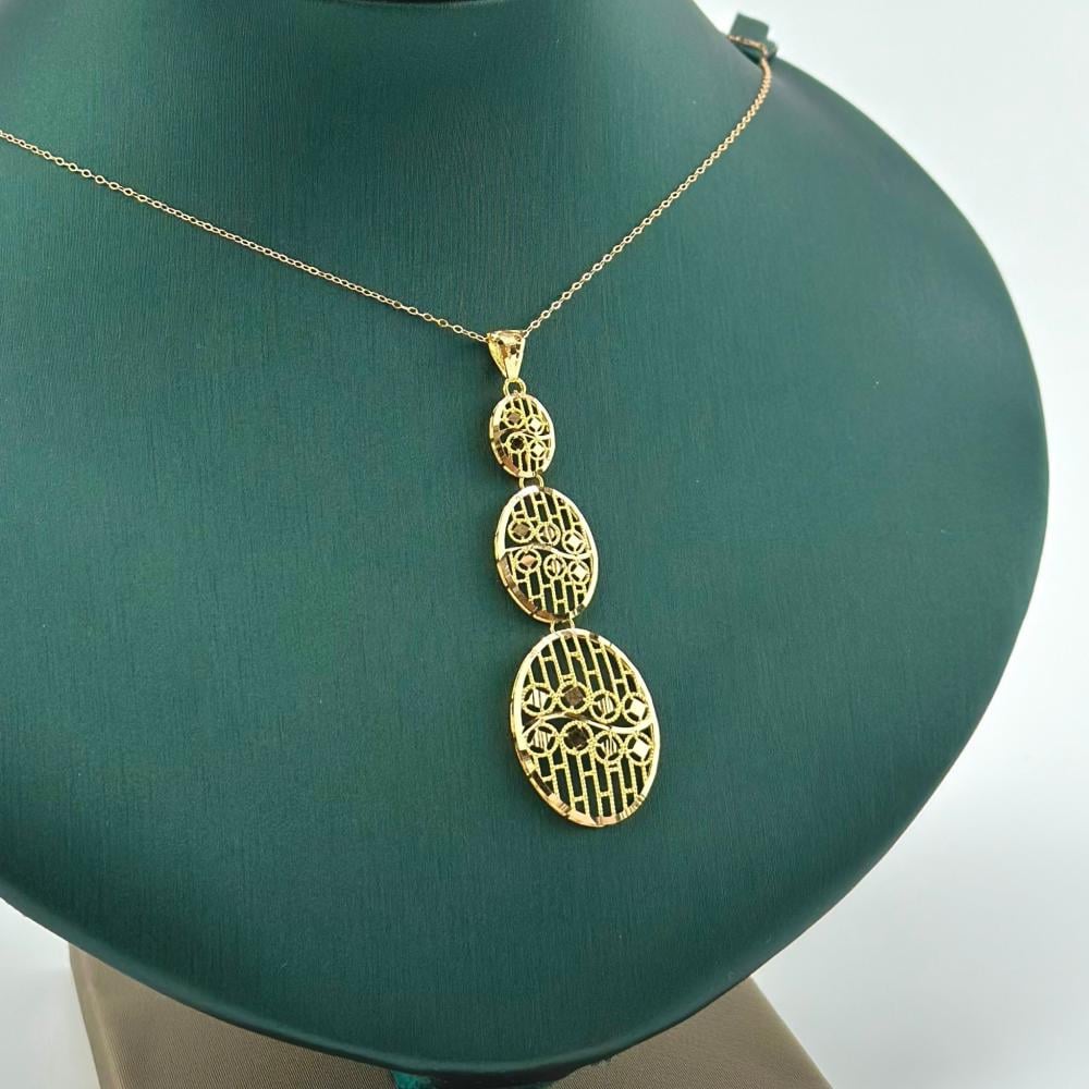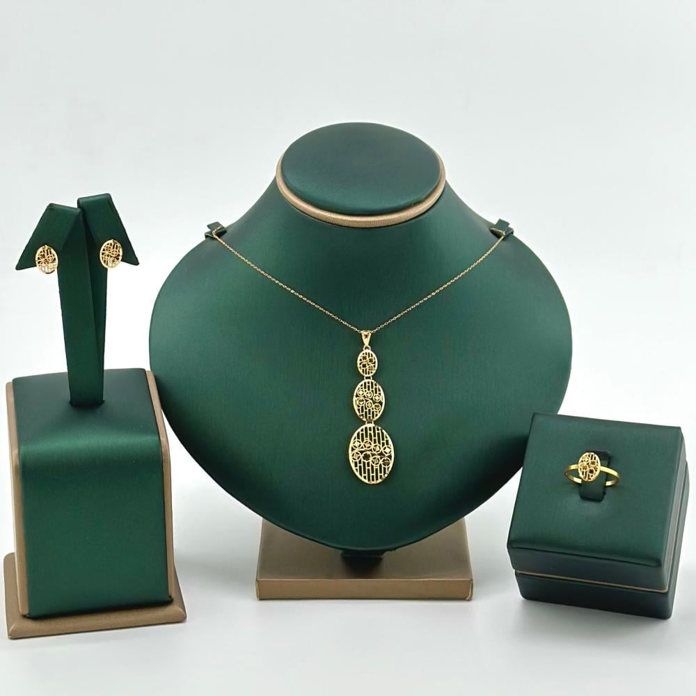 يتضمن هذا النصف طقم سلسالًا رفيعًا مع تعليقة دائرية وخاتمًا ناعمًا وحلقين ناعمين، جميعها مصنوعة من الذهب الأصفر الخالص عيار 21. يتميز التصميم ببساطته وأناقته، مما يجعله مثاليًا للاستخدام اليومي أو للمناسبات الخاصة.