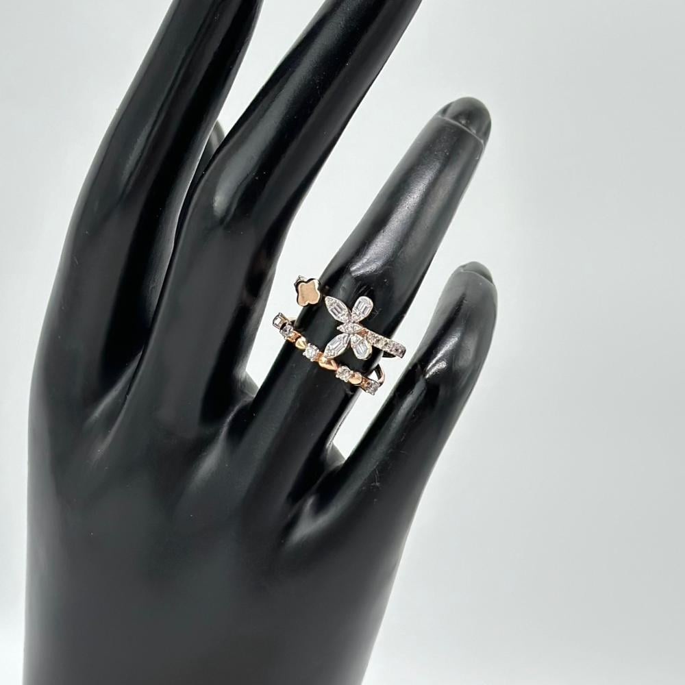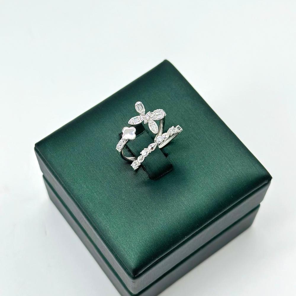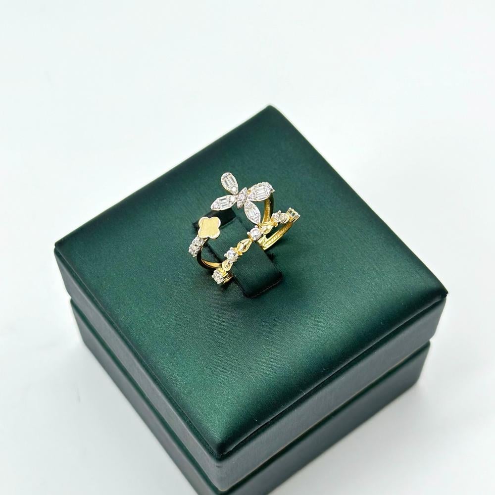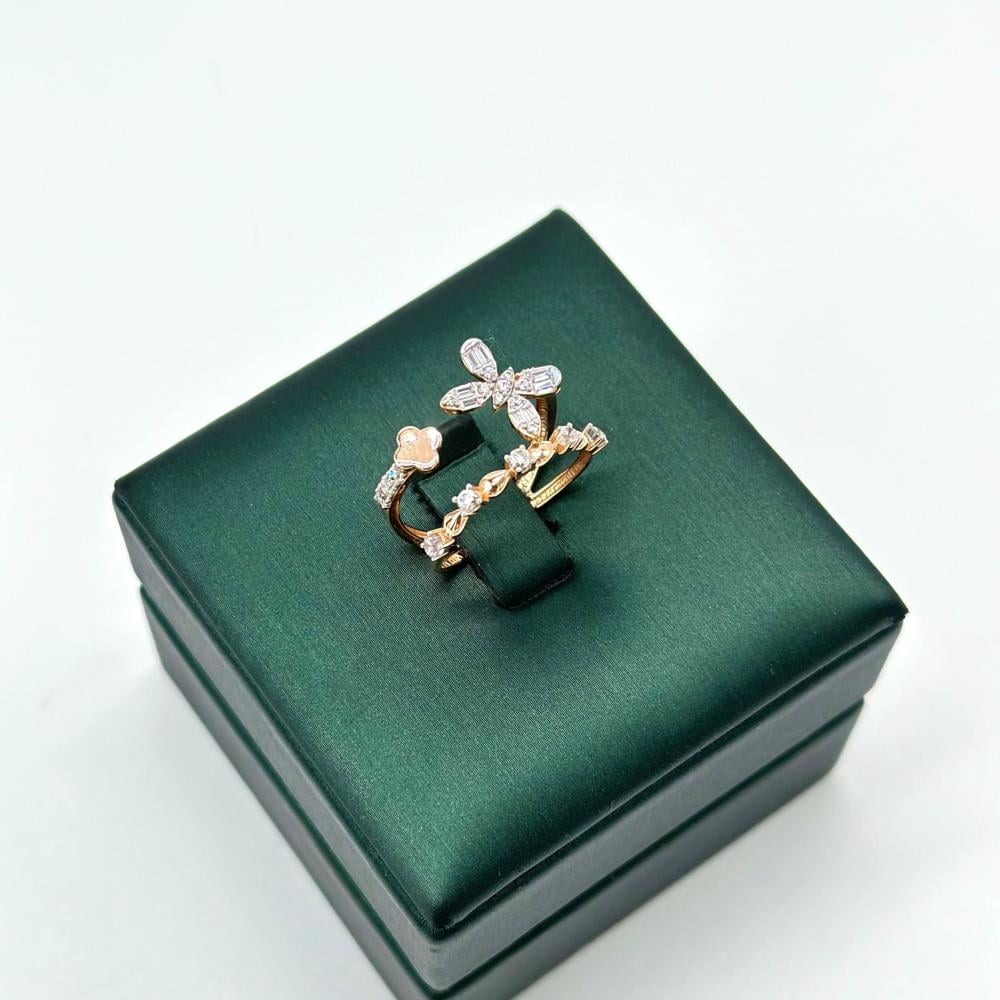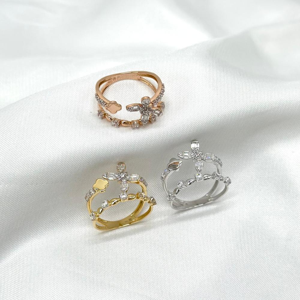خاتم ذهب أبيض عيار 18 بوزن 2.7 جرام، تصميم "الفراشة الملكية" بمسارين أنيقين، مرصع بفصوص الزركون وقصات الباقيت. لمسة فنية راقية تلفت الأنظار.
